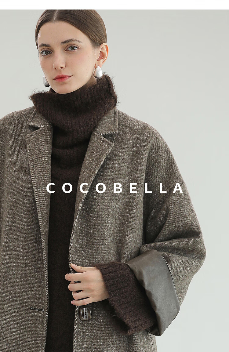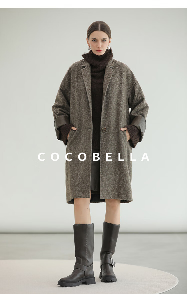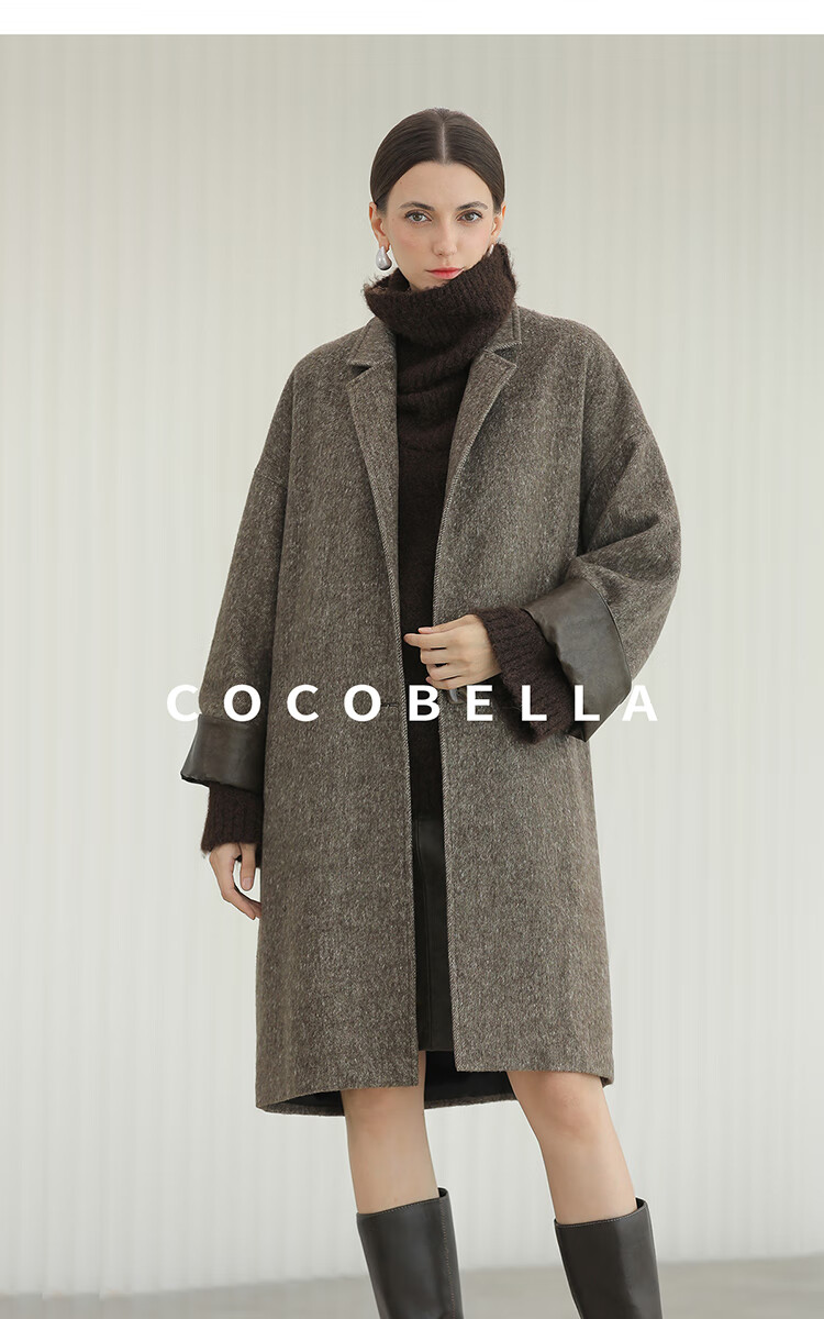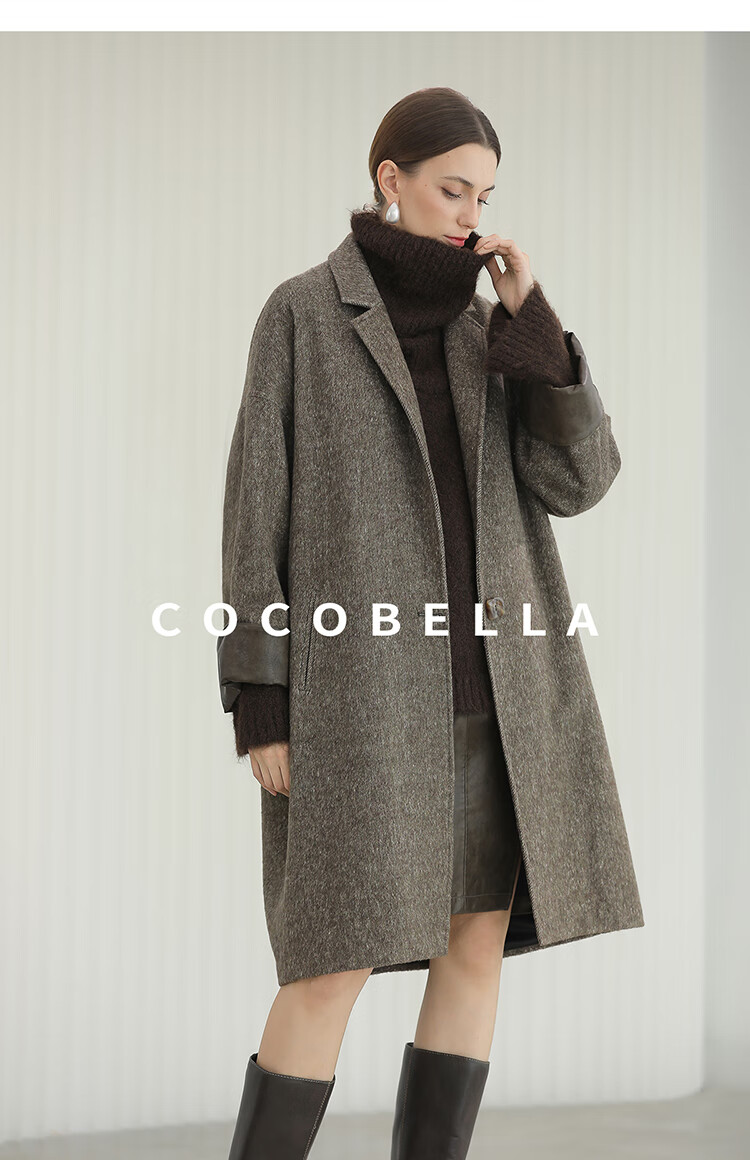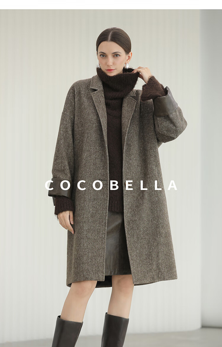 COCOBELLA复古斜纹品质大衣冬翻折PU袖口中长款毛呢外套WL3007