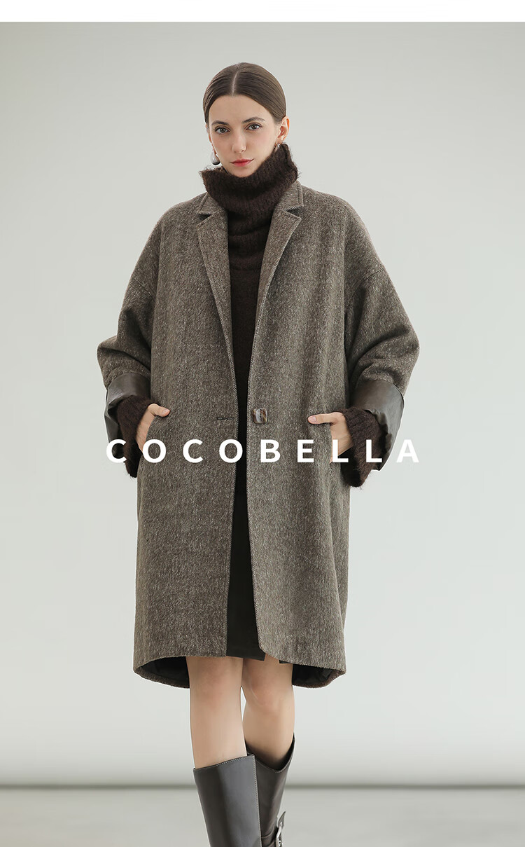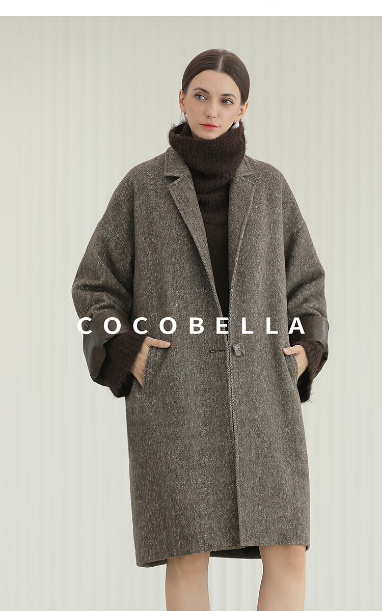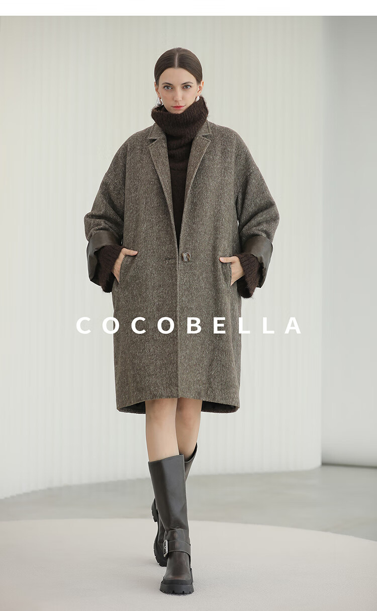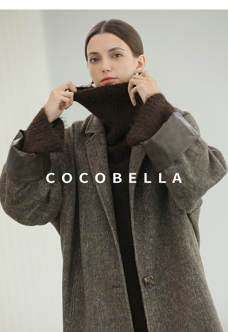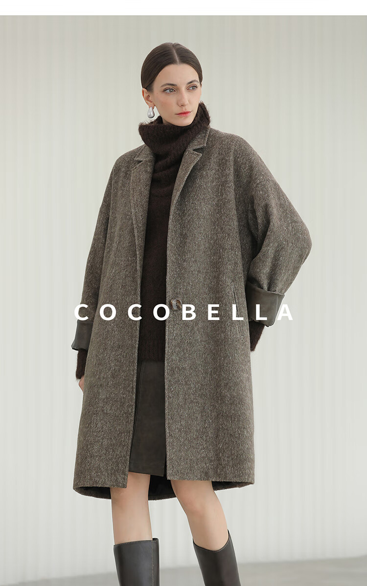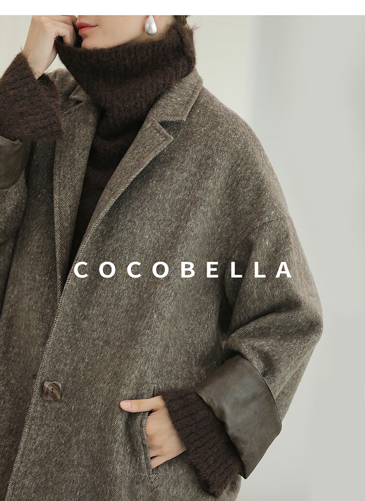 COCOBELLA复古斜纹品质大衣冬翻折PU袖口中长款毛呢外套WL3007