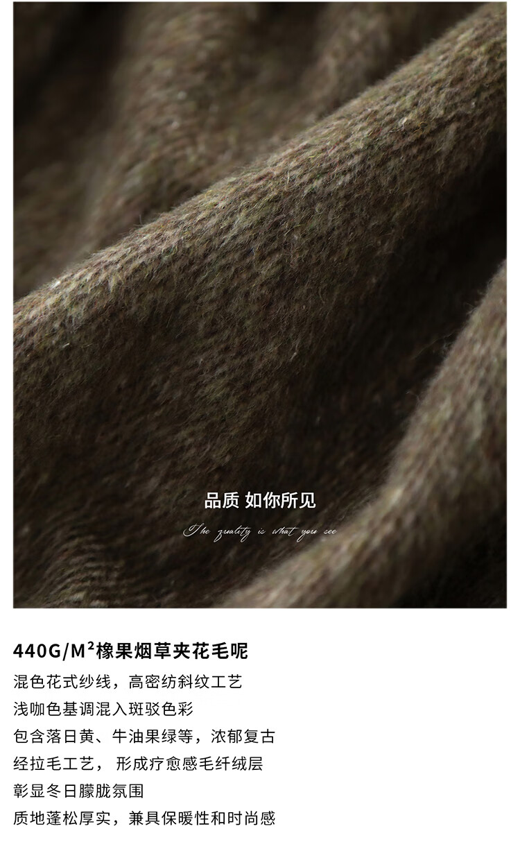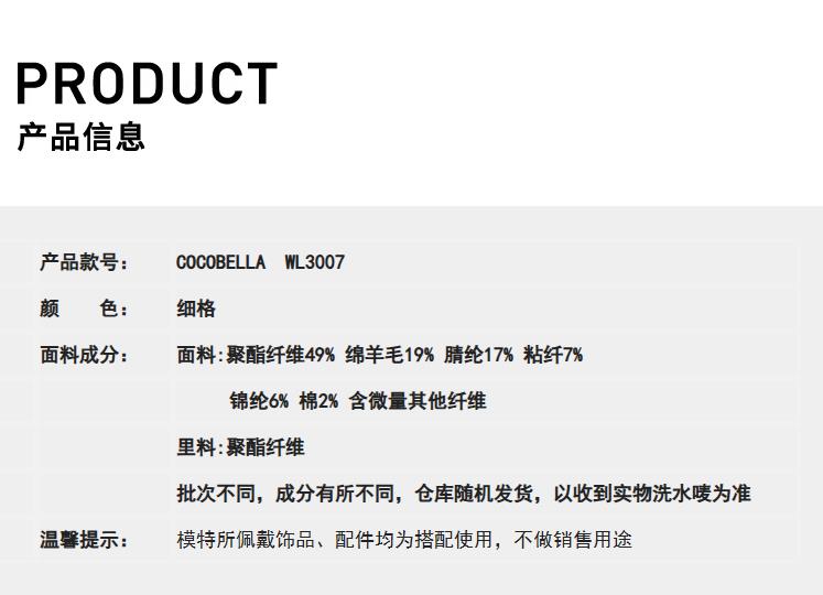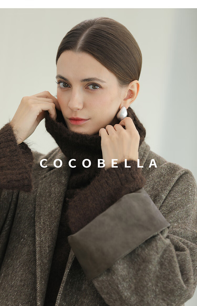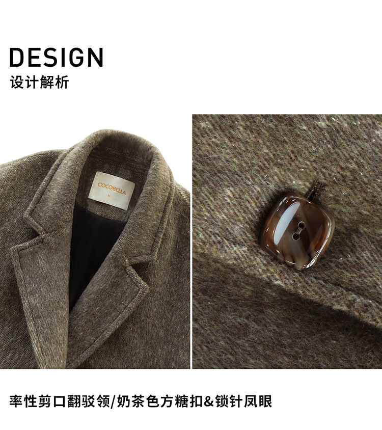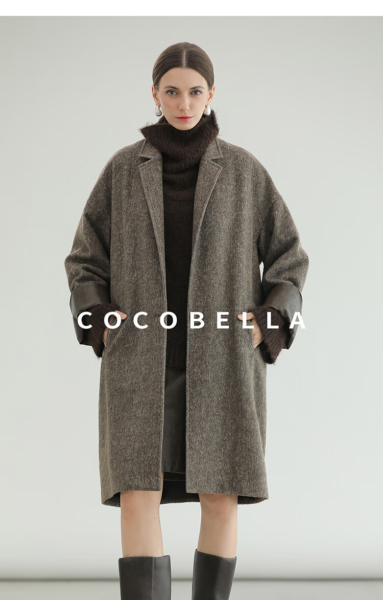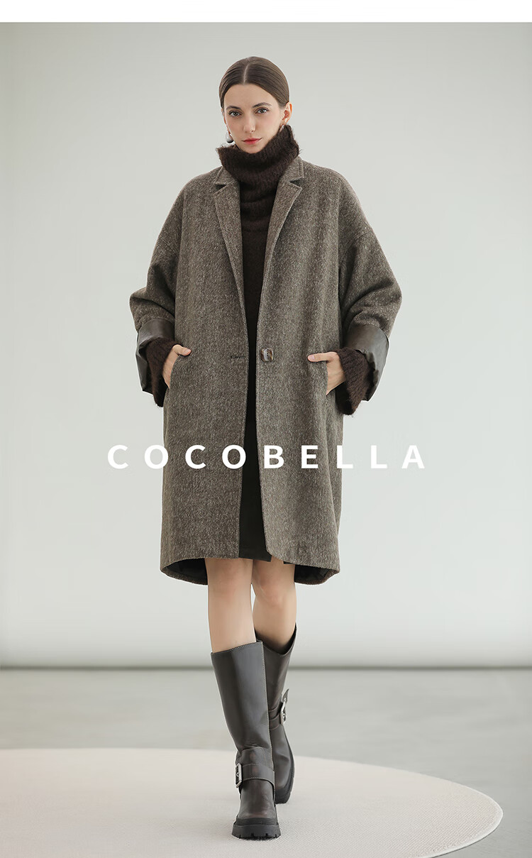 COCOBELLA复古斜纹品质大衣冬翻折PU袖口中长款毛呢外套WL3007