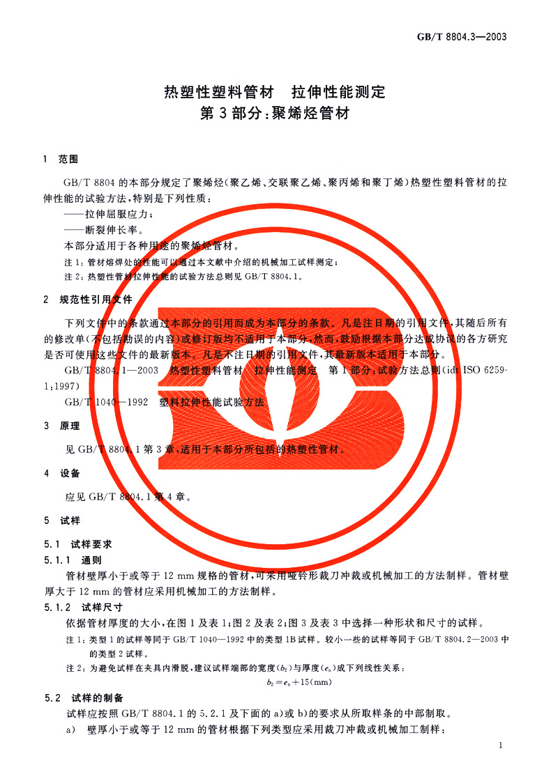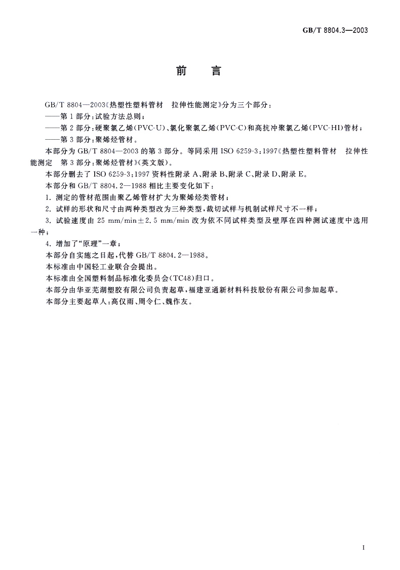 GB/T 8804.3-2003【国家标准】 热塑性塑料管材 拉伸性能测定 第3部分:聚烯烃管材