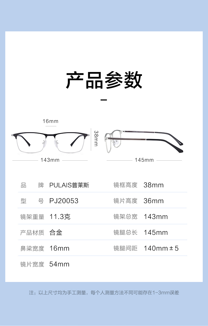 普莱斯PJ20053 光学镜框 复古设计轻量舒适 商务休闲镜框 合金材质 三色可选