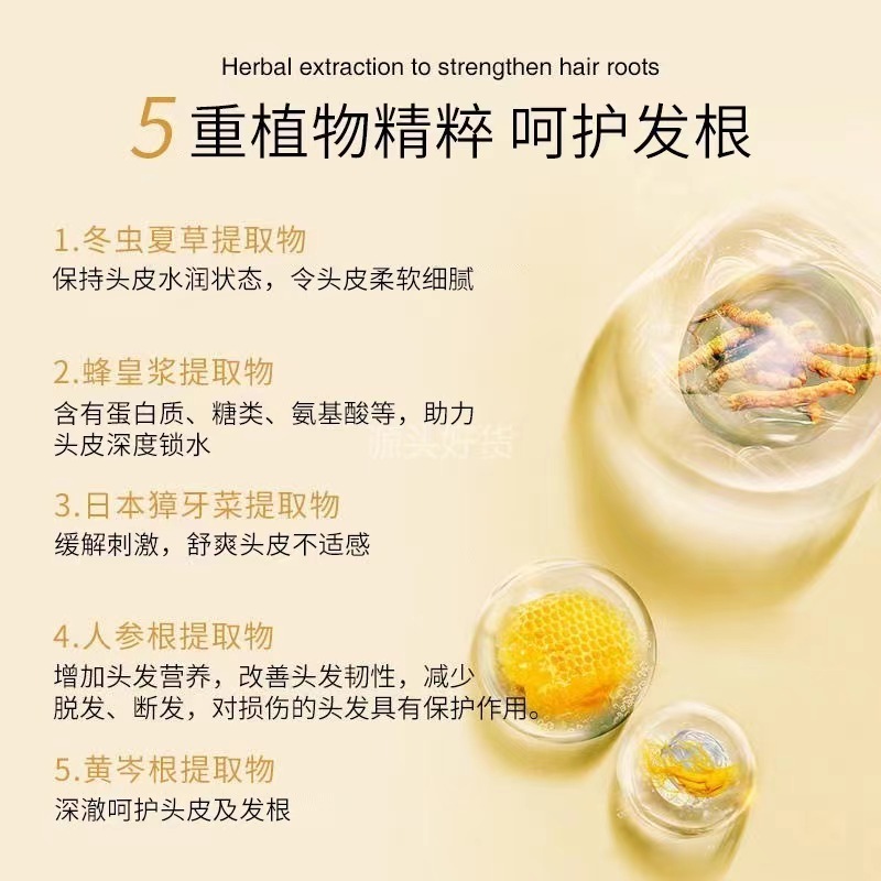 5种珍稀草本复配精华 补充毛发中缺少或流失的角蛋白 修护受损发质,促使头发强健