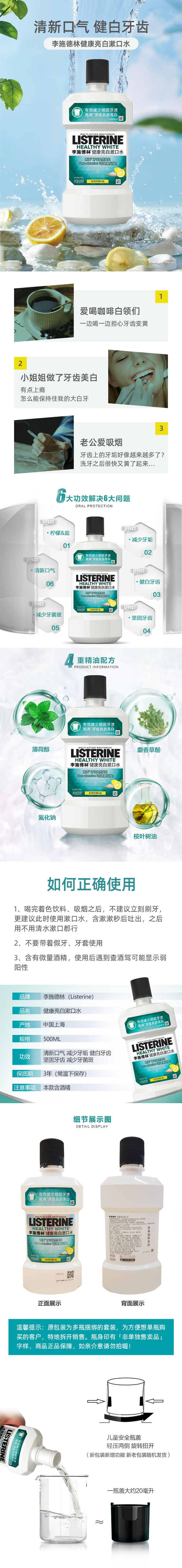 李施德林健康亮白漱口水健白口味500ML*1瓶 / 3瓶