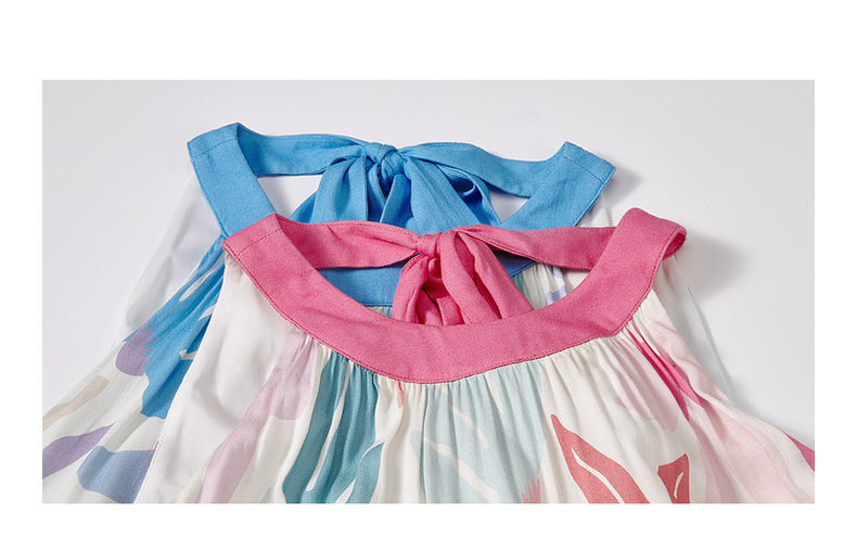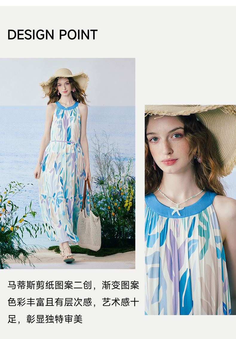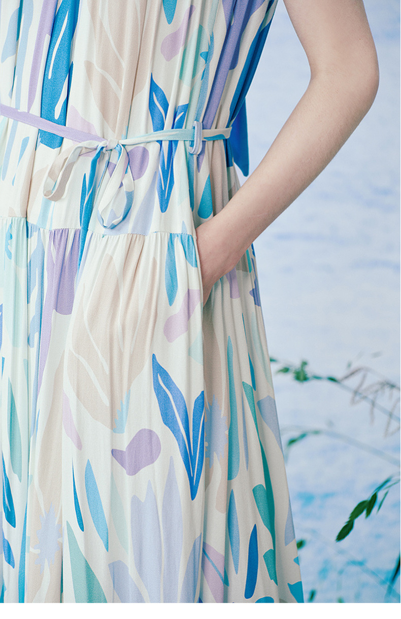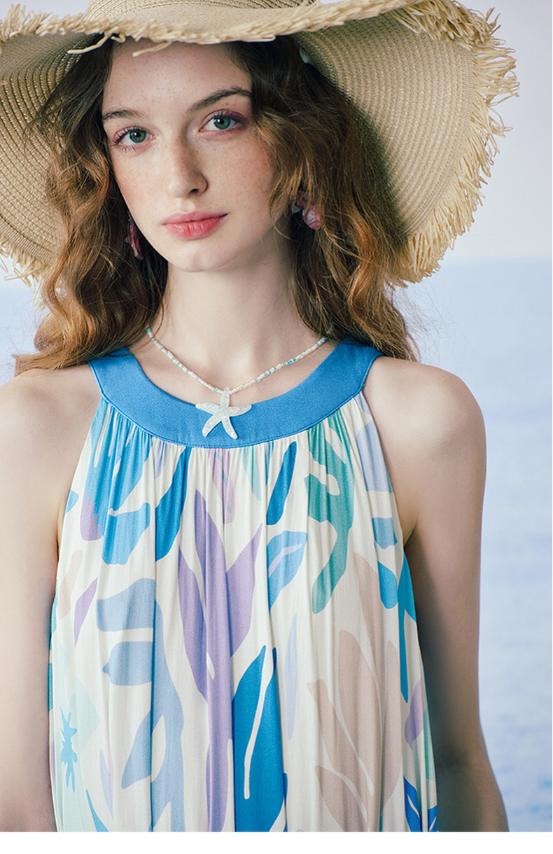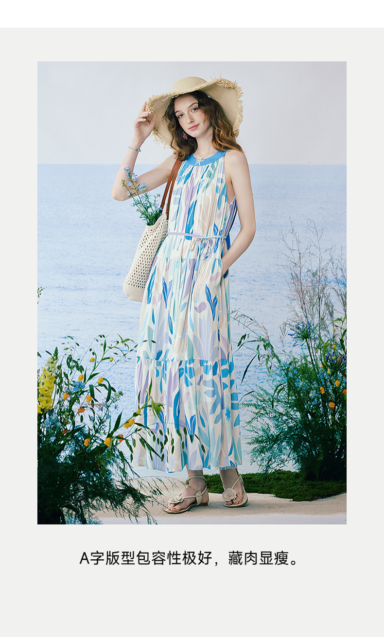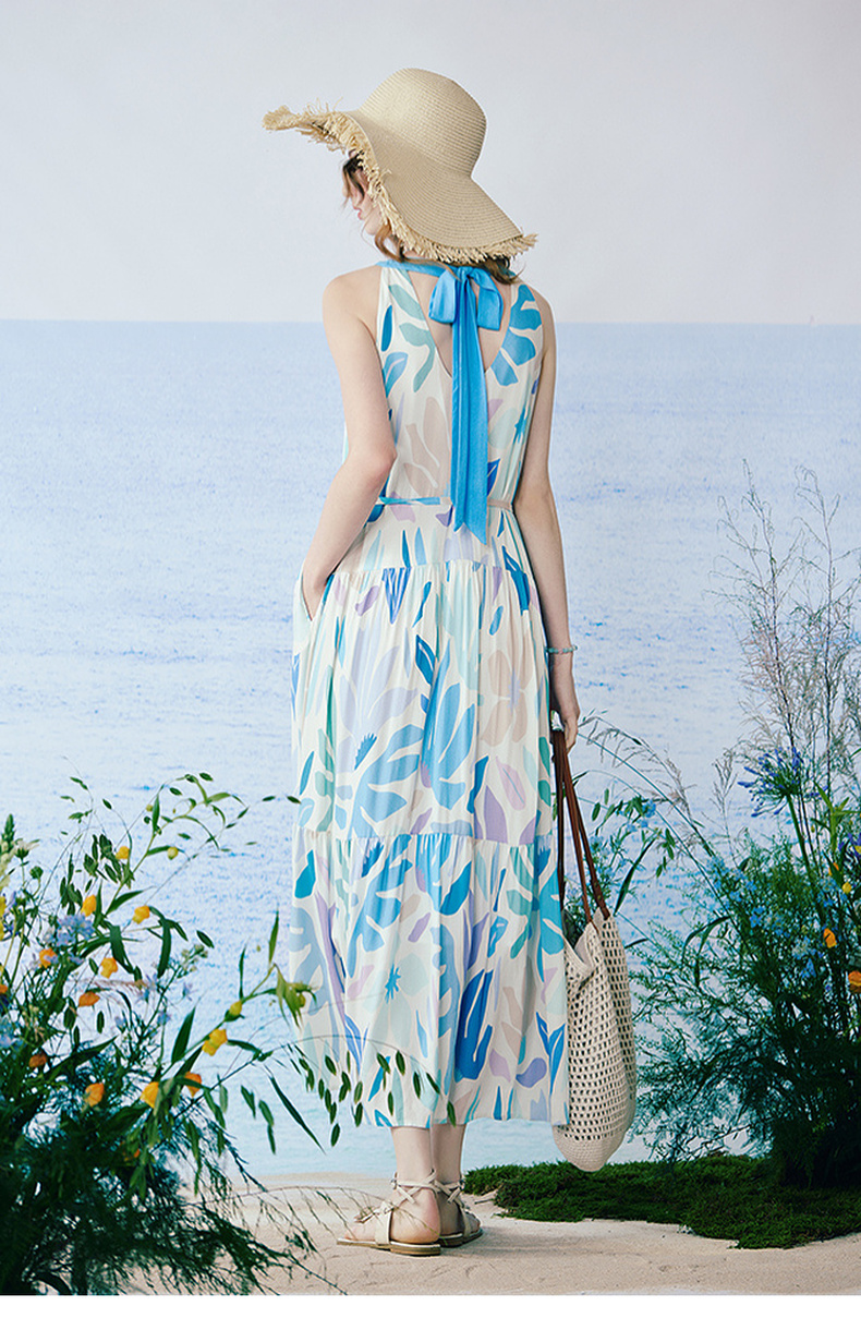 两三事 海屿漫花 2025夏季新款度假风剪纸印花绑带无袖连衣裙长裙