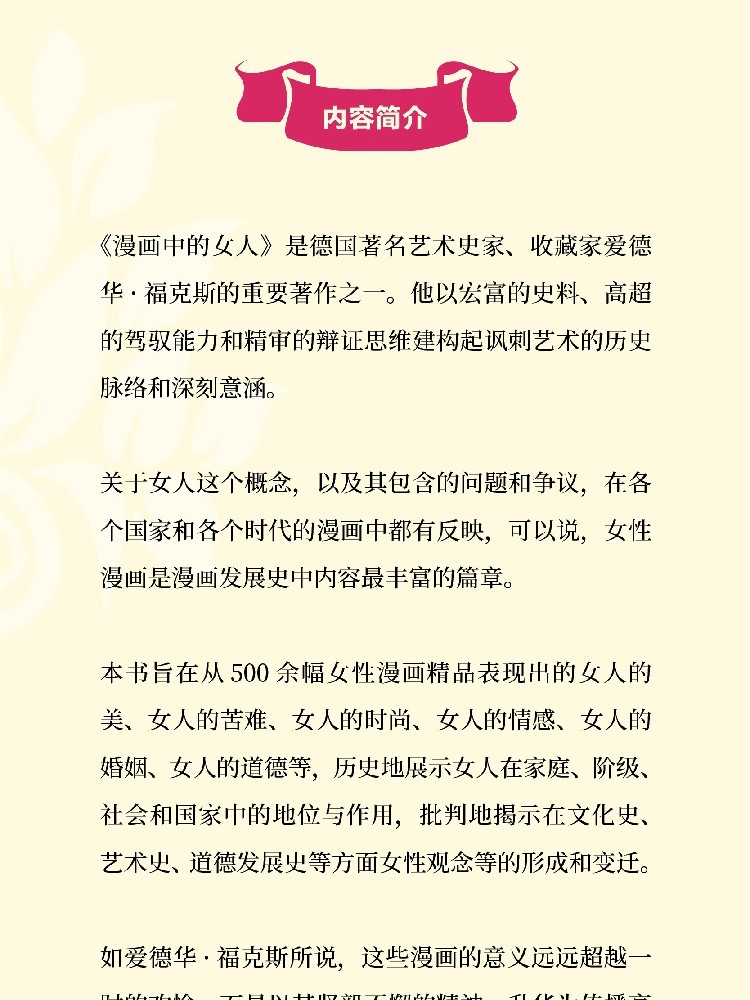 本书旨在从500余幅女性漫画精品表现出的女人的美、女人的苦难、女人的时尚、女人的情感、女人的婚姻、女人的道德等,历史地展示女人在家庭、阶级、社会和国家中的地位与作用,批判地揭示在文化史、艺术史、道德发展史等方面女性观念等的形成和变迁。