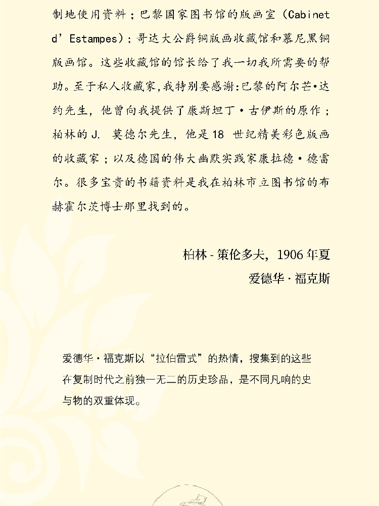 在写作这本书时,我也获得了很多朋友、私人收藏家和公共收藏部门的大力支持。在放下手中的笔之前,我必须在这里对他们表示衷心的感谢。公共收藏部门首先是巴黎的卡内瓦莱特博物馆(Musee Carnevalet),法国艺术科学部允许我在那里不受限制地使用资料;巴黎国家图书馆的版画室(Cabinet d’Estampes);哥达大公爵铜版画收藏馆和慕尼黑铜版画馆。这些收藏馆的馆长给了我一切我所需要的帮助。至于私人收藏家,我特别要感谢:巴黎的阿尔芒·达约先生,他曾向我提供了康斯坦丁·古伊斯的原作;柏林的J. 莫德尔先生,他是18 世纪精美彩色版画的收藏家;以及德国的伟大幽默实践家康拉德·德雷尔。很多宝贵的书籍资料是我在柏林市立图书馆的布赫霍尔茨博士那里找到的。