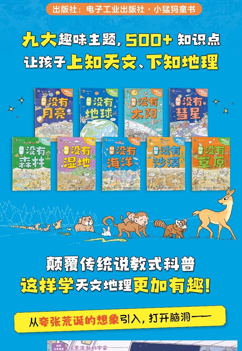 本系列是一套充满想象和探索趣味的少儿科普读物。当我们抬头看向天空时,总会忍不住对遥远的天体产生好奇;当我们低头看下脚下时,又会禁不住感叹地球的奇妙。从地球到太空、从自然到人文、从史前到现在,从微观到宏观……我们的生活离不开"天文”和"地理”。本系列用疯狂的想象作为引入,让孩子畅想如果没有太阳、地球、月亮、彗星、森林、海洋、湿地、草原、沙漠,一切会变成什么样子?通过引爆孩子的想象力,激发孩子的探索欲和求知欲,然后用漫画的形式为孩子讲解天文地理方面的知识,从而让孩子更好地认识这个世界!
