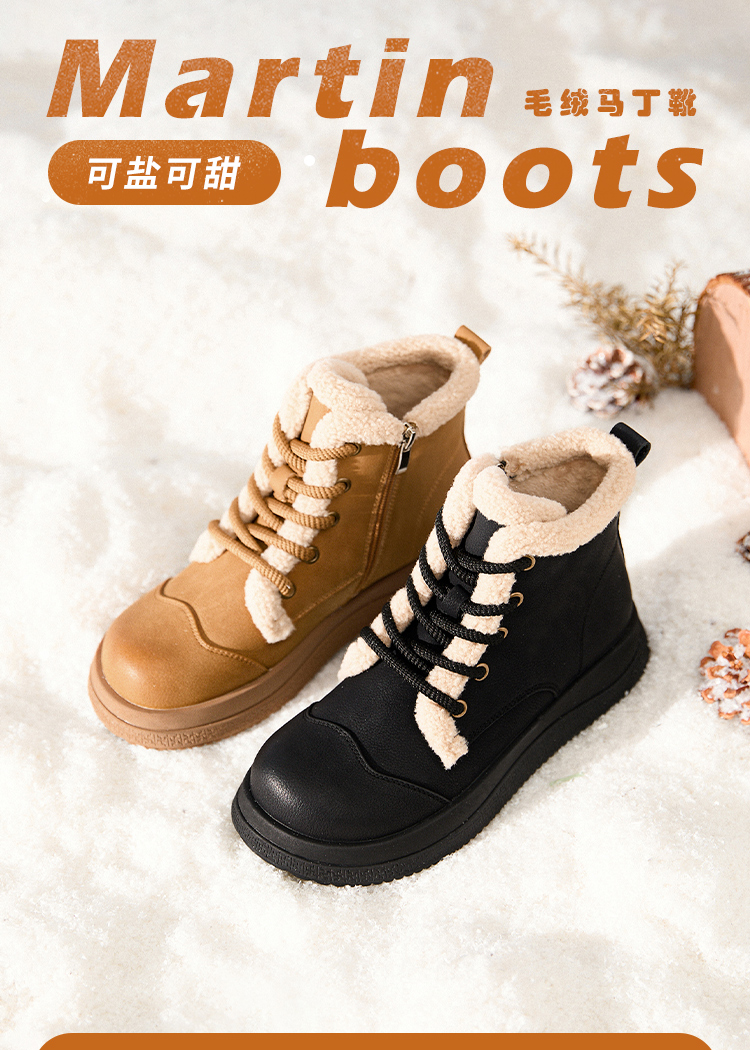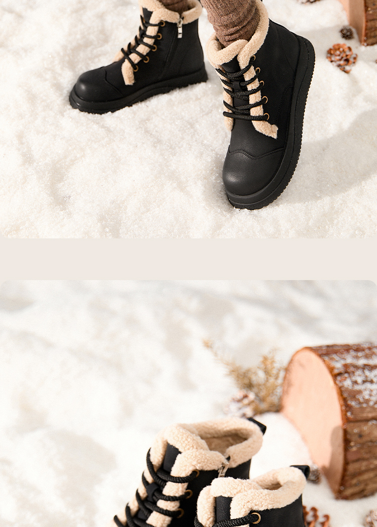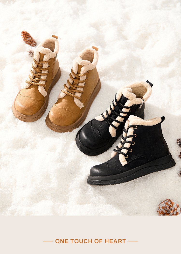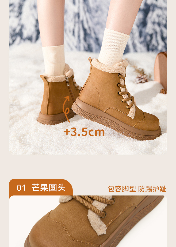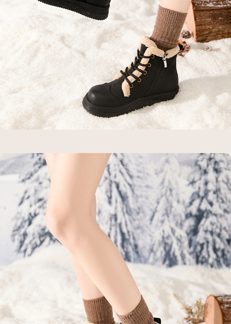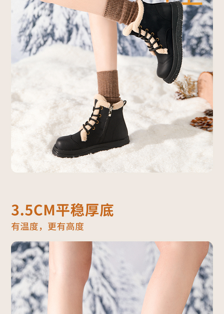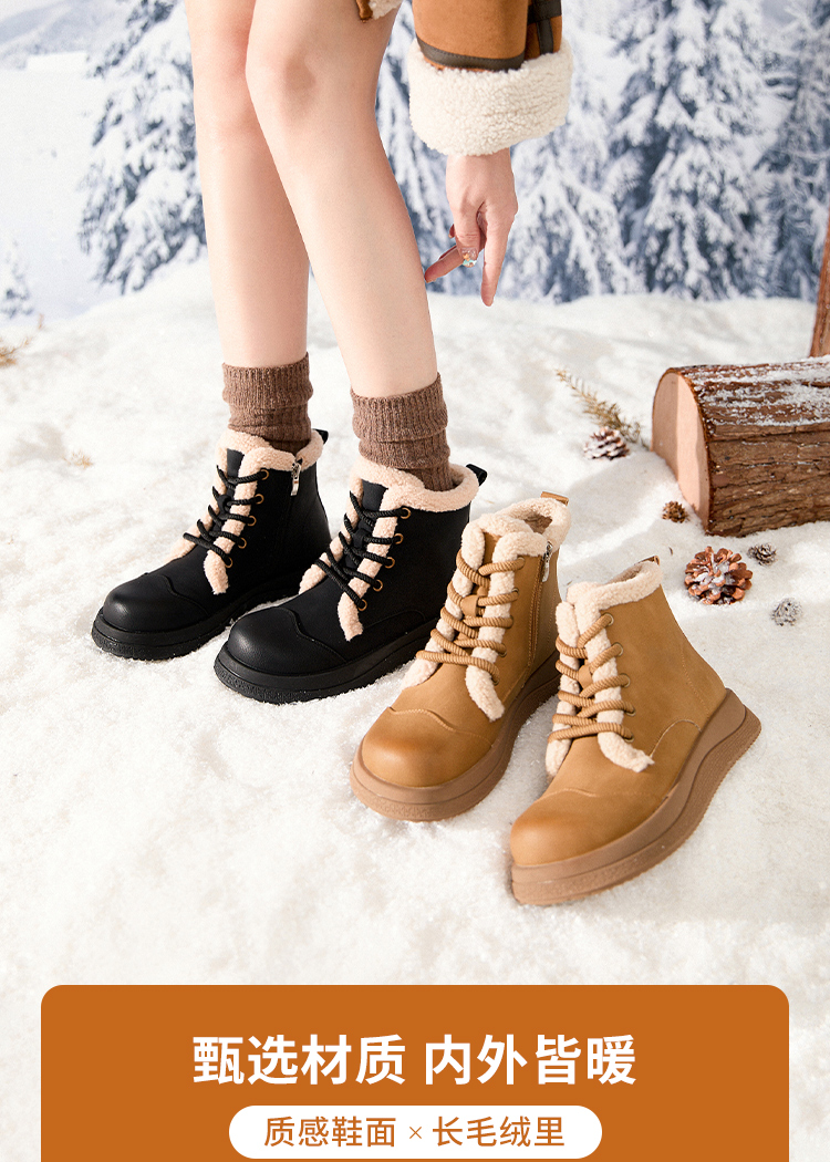 西遇加绒马丁靴女2025新款冬季复古系带短靴厚底棉鞋子保暖雪地靴D4347835