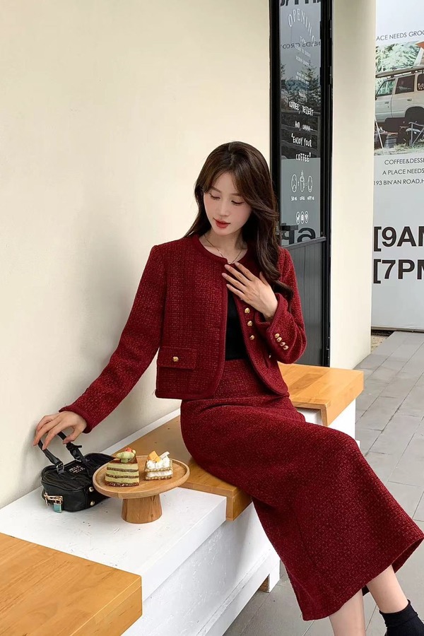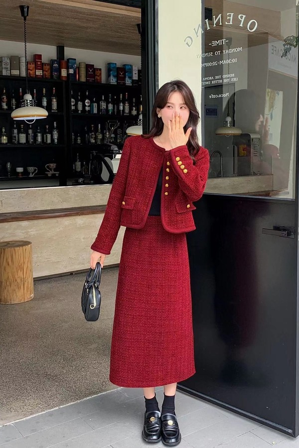 Le Malene 小香风红色节日氛围外套半裙套装 19248