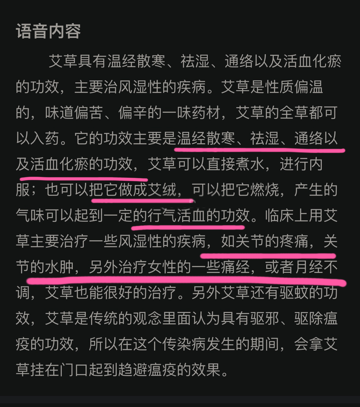 明李时珍《本草纲目》有记录:艾以叶入药,性温、味苦、无毒、纯阳之性、通十二经、具回阳、理气血、逐湿寒、止血安胎等功效,亦常用于针灸。故又被称为“医草”
