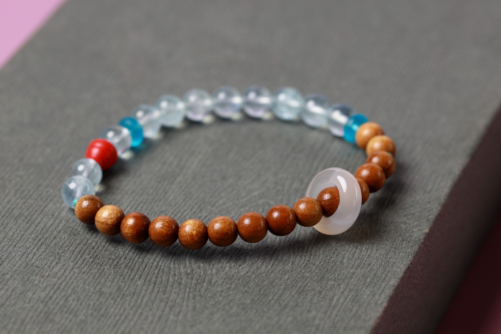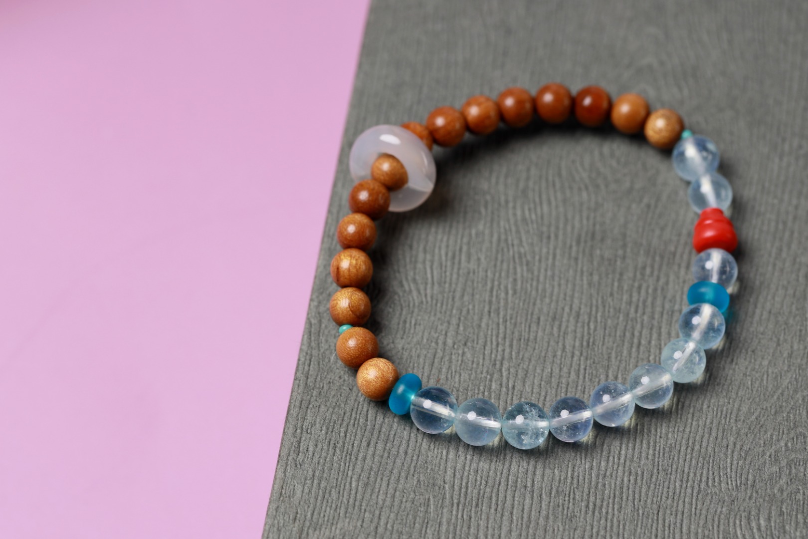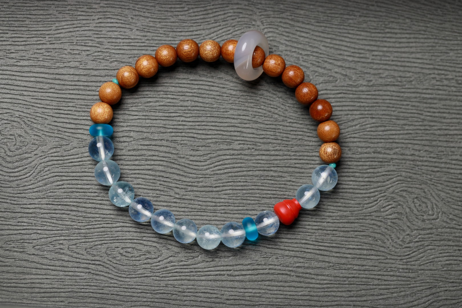 海蓝宝和金丝楠的搭配,与料相配。加上一颗朱砂小墩葫芦点缀,增加灵动感。