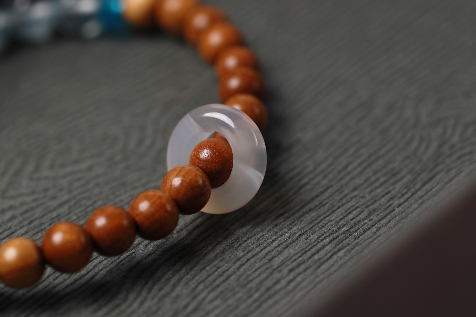 白玛瑙平安环点缀两颗琉璃隔片蓝让整个手串在沉稳的基础上又增加了几分俏皮。