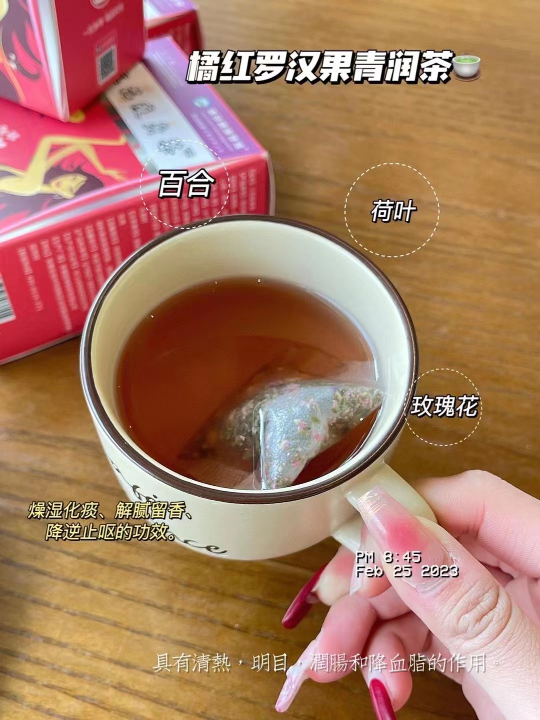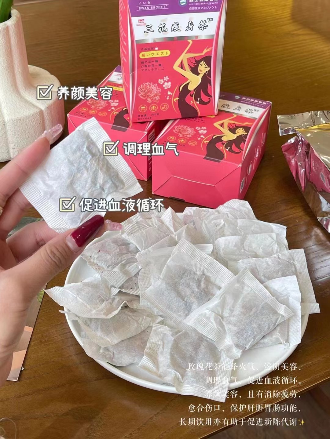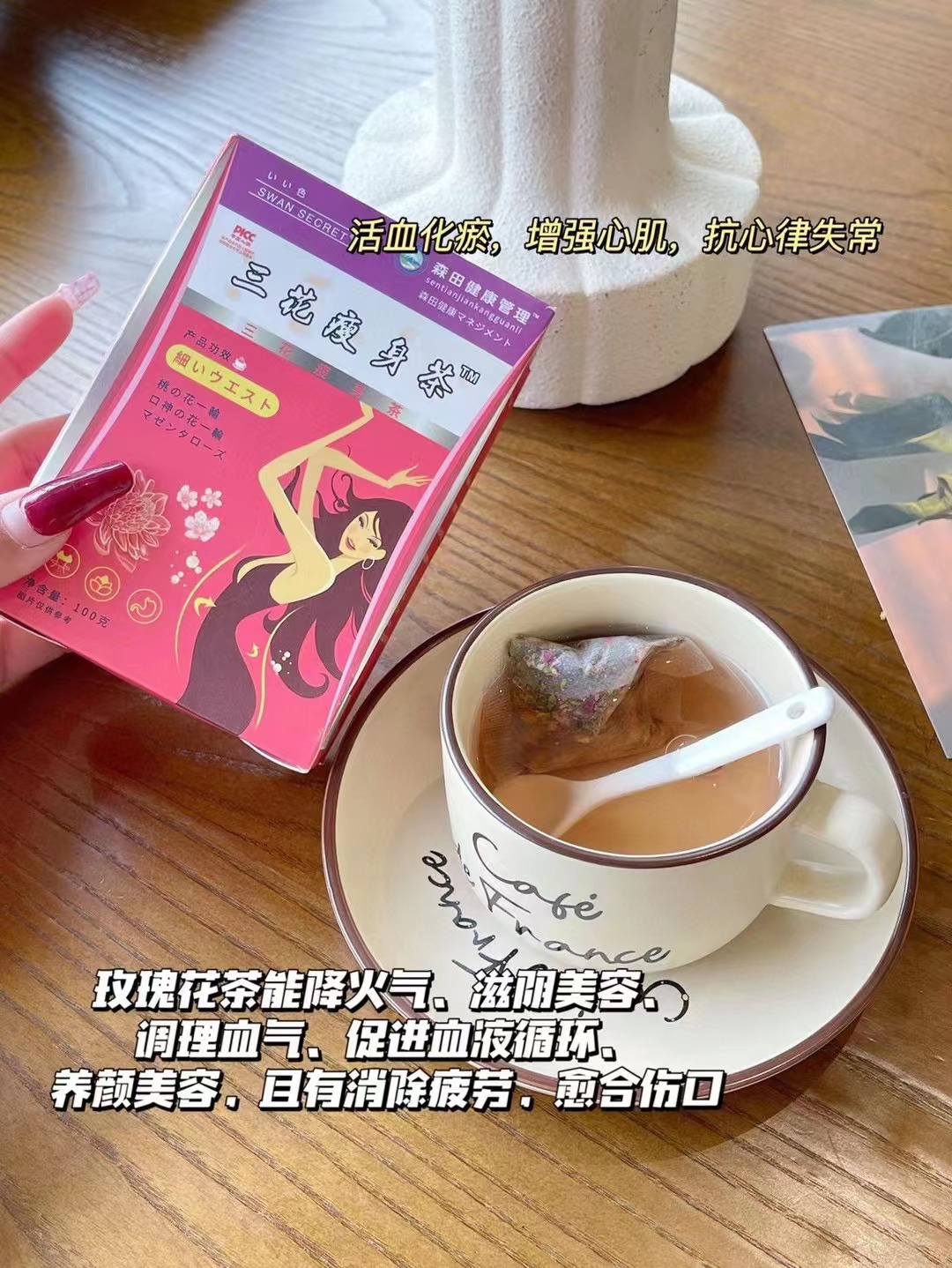 功效:茶含有多种天然草本成分,能够加强脂肪代谢,帮助你肠胃畅通,将废弃物和毒素赶出体外,身形轻盈自然。但是例假期间和孕妇不能喝噢