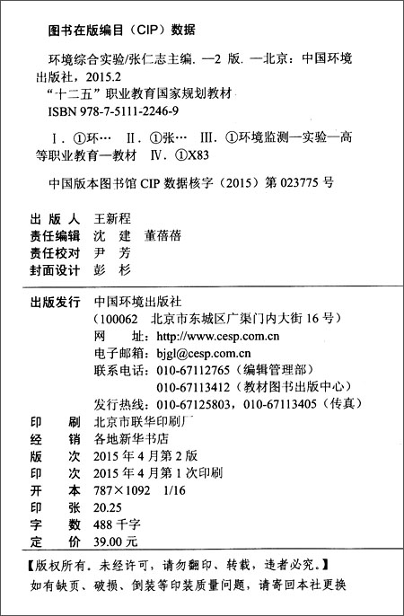 环境综合实验(第二版)"十二五"职业教育国家规划教材 经全国执业教育教材审定委员会审定 张仁志 9787511122469