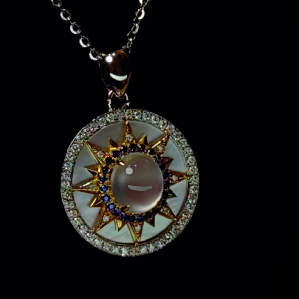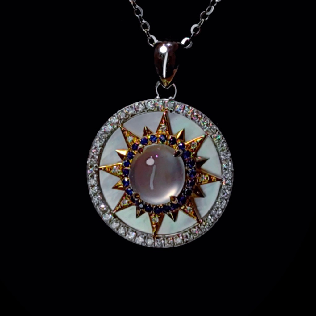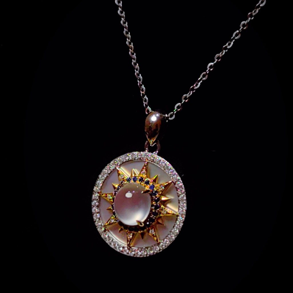 外围星芒状设计精妙环绕,颗颗钻石与宝石如繁星闪烁,与中央翡翠交相辉映,似星光映月,将璀璨与灵秀完美融合,仿若把宇宙的浪漫私藏。佩戴于颈间,每一次转身,每一道目光,皆是光芒的诗意绽放。