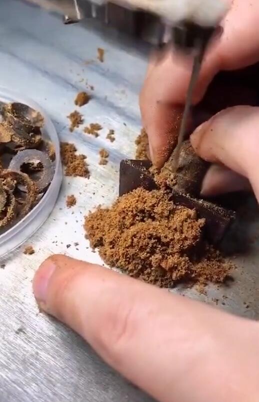 天然奇楠粉,平时如果不开料,不会有奇楠粉末的。而且奇楠大料过锯台的时候才会有。
