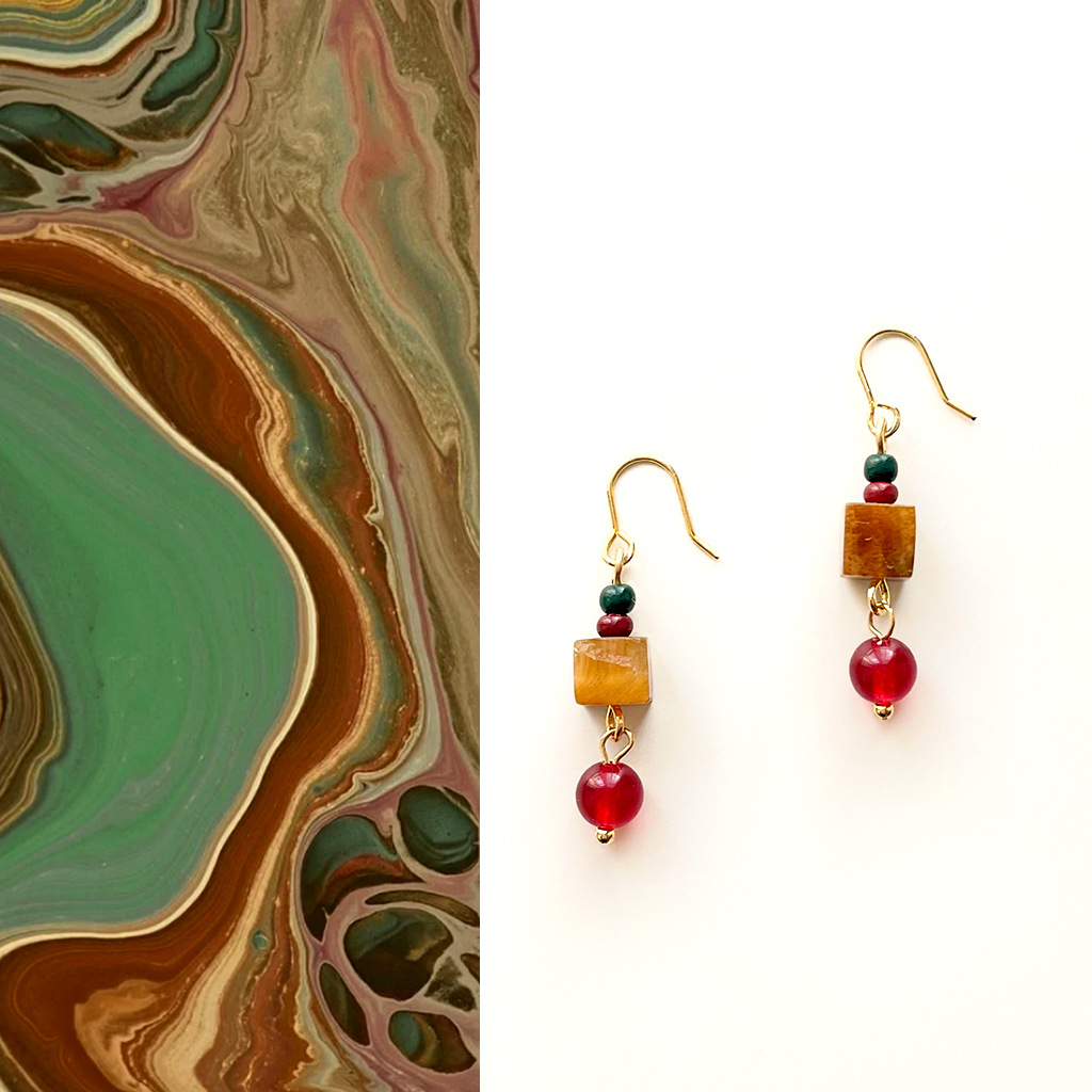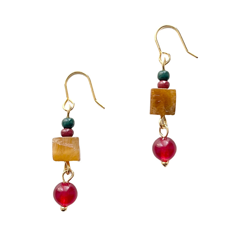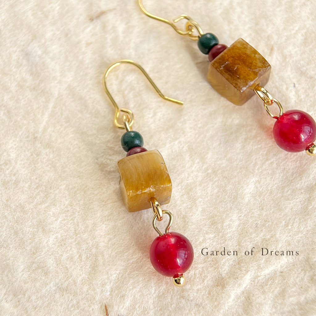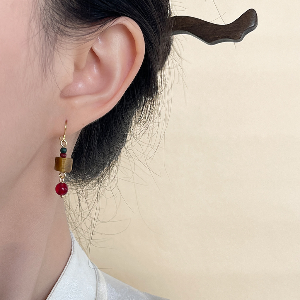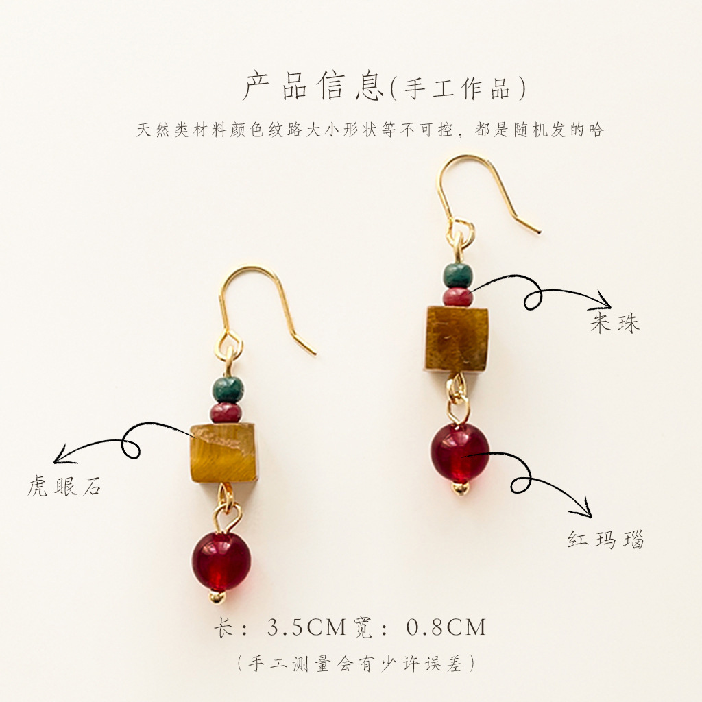 【材质】铜耳钩、虎眼石、红玛瑙