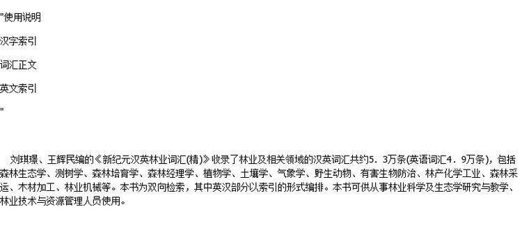新纪元汉英林业词汇 8988 森林生态测树森林培育森林经理植物土壤野生动物 有害生物防治林产化学工业森林采运木材加工林业机械 书
