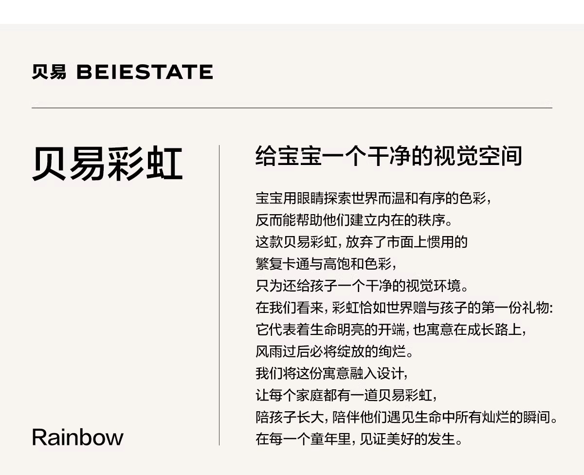 - 「BEIESTATE贝易」以极简设计为风格,主打兼顾设计、品 质和性价比的母婴产品,以创造极致细腻、不张扬、 不世俗的当代母婴用具,为用户日常亲子生活与幼儿 的启蒙早教提供新选择。