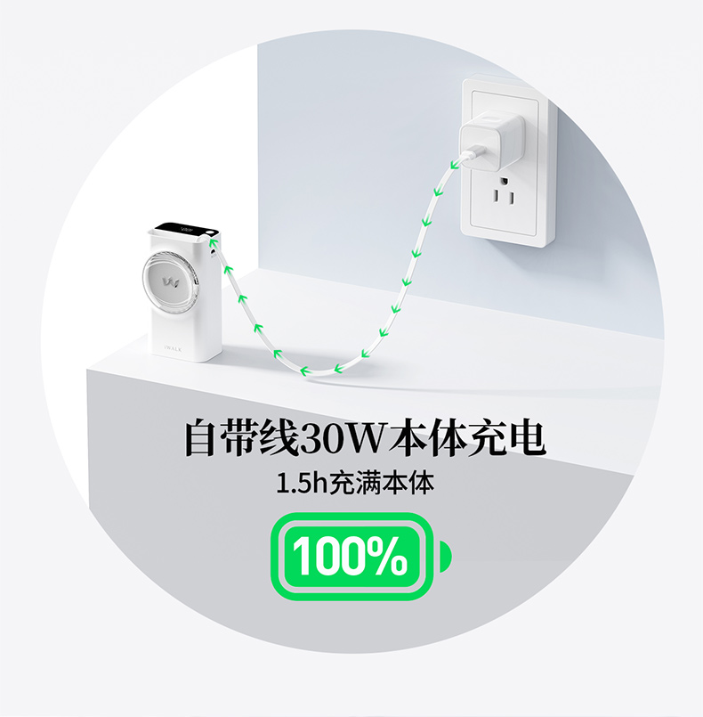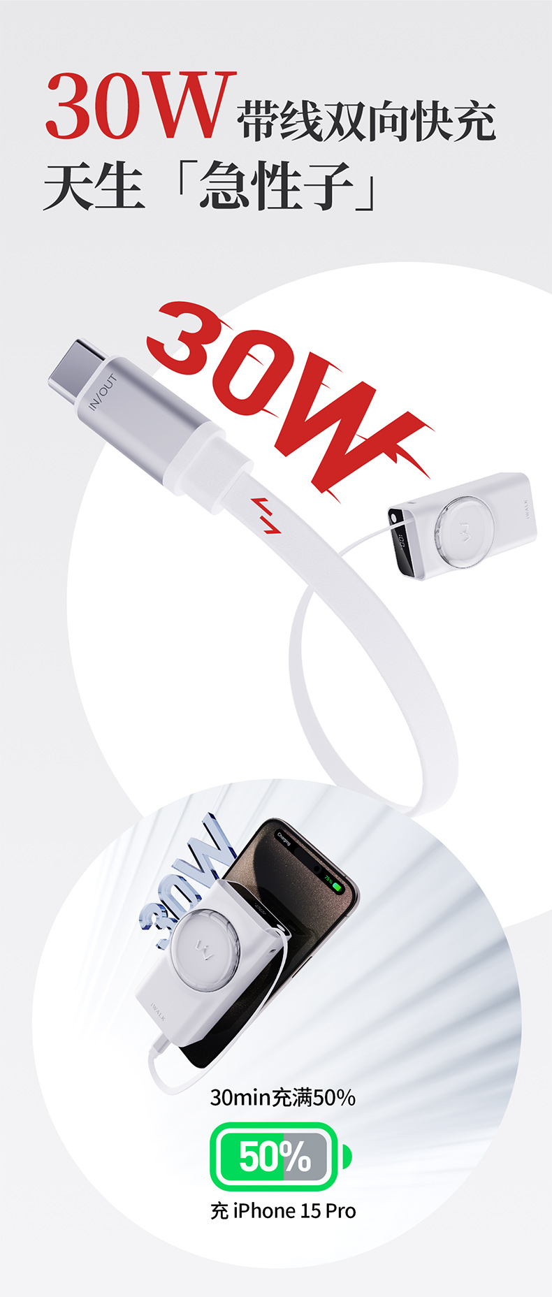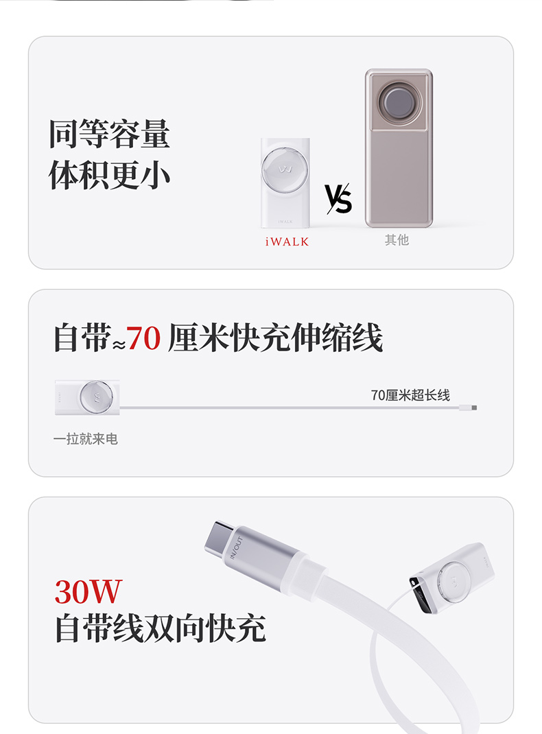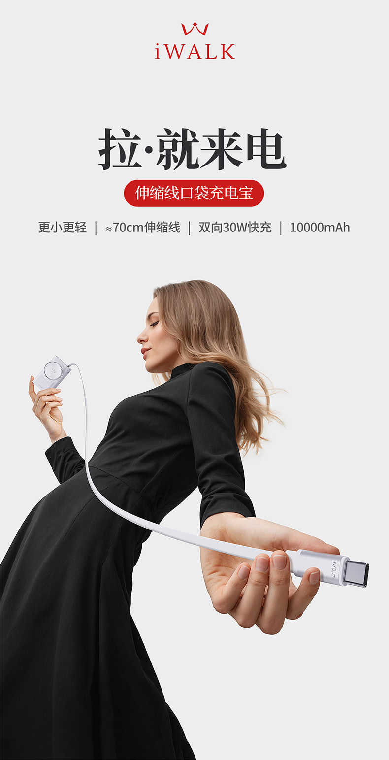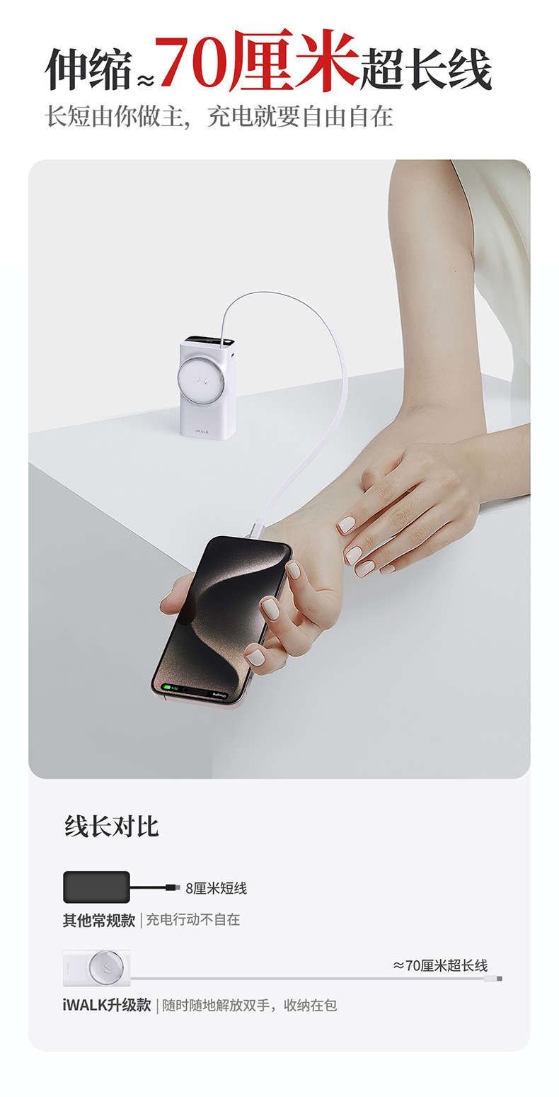 【国家3C认证】爱沃可(iWALK) LPR001 L/C 10000毫安双向30W快充伸缩线充电宝 自带线30W双向快充,解锁快充新体验。新伸缩线设计,拉上就充,清爽收纳。