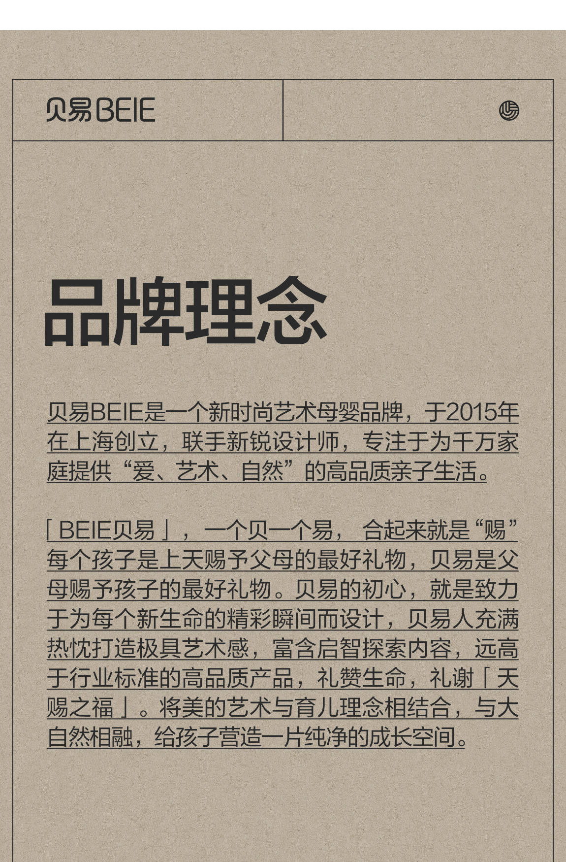 - 「BEIESTATE贝易」以极简设计为风格,主打兼顾设计、品 质和性价比的母婴产品,以创造极致细腻、不张扬、 不世俗的当代母婴用具,为用户日常亲子生活与幼儿 的启蒙早教提供新选择。