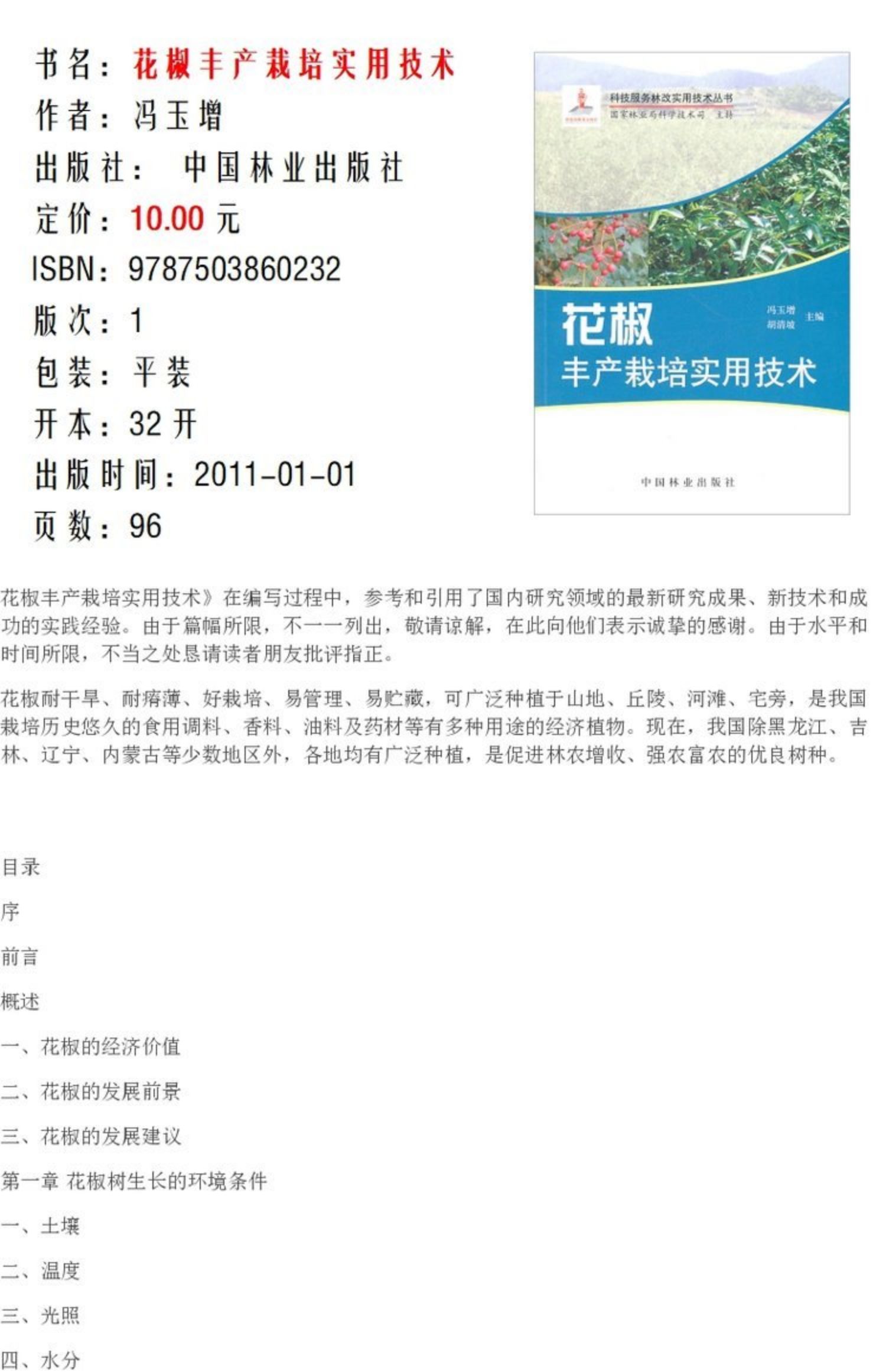 花椒丰产栽培实用技术 6023 花椒树生长的环境条件 花椒树整形修剪 病害识别与防治 害虫识别与防治 采收贮藏加工 中国林业出版社