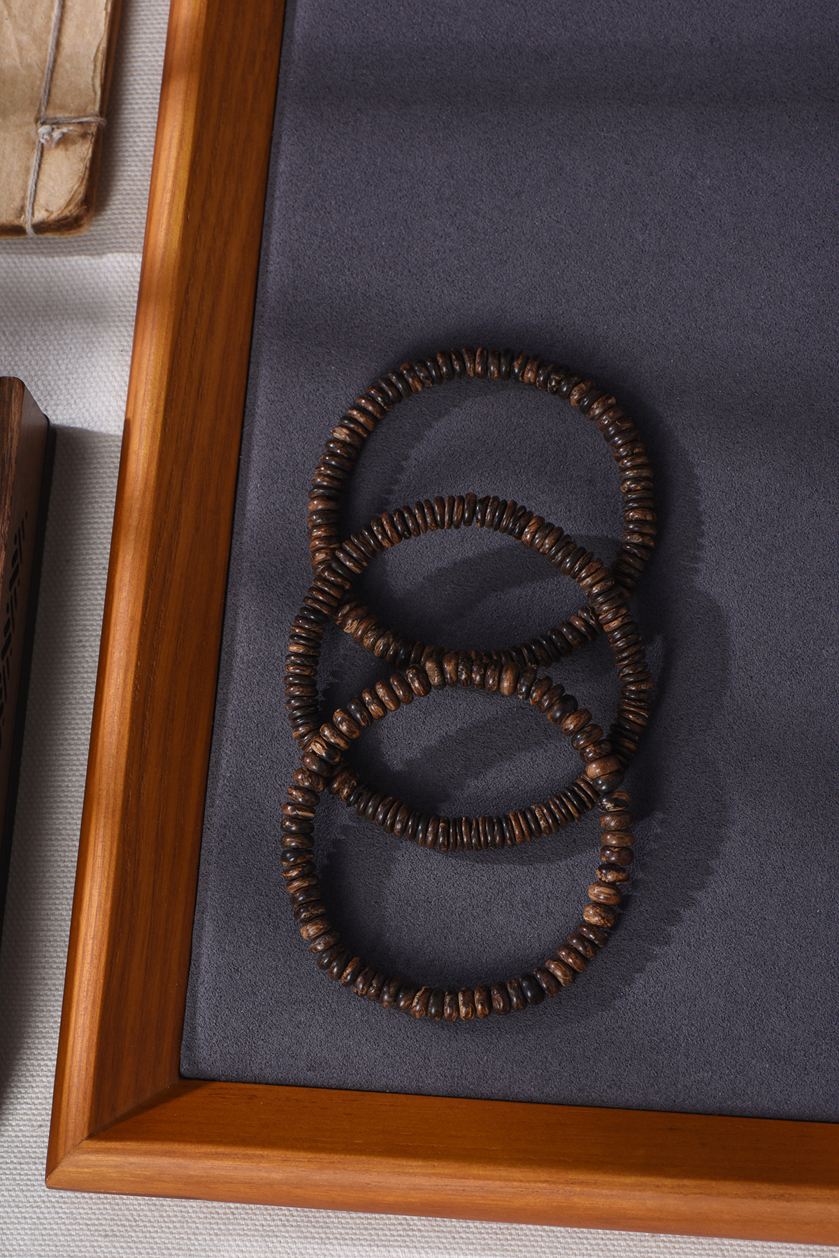 凑近看珠子表面,黑褐相间的油脂线如虎纹般交错,深邃的色泽里还能清晰看到木质纤维的纹理 —— 这正是野生老料的标志性特征。