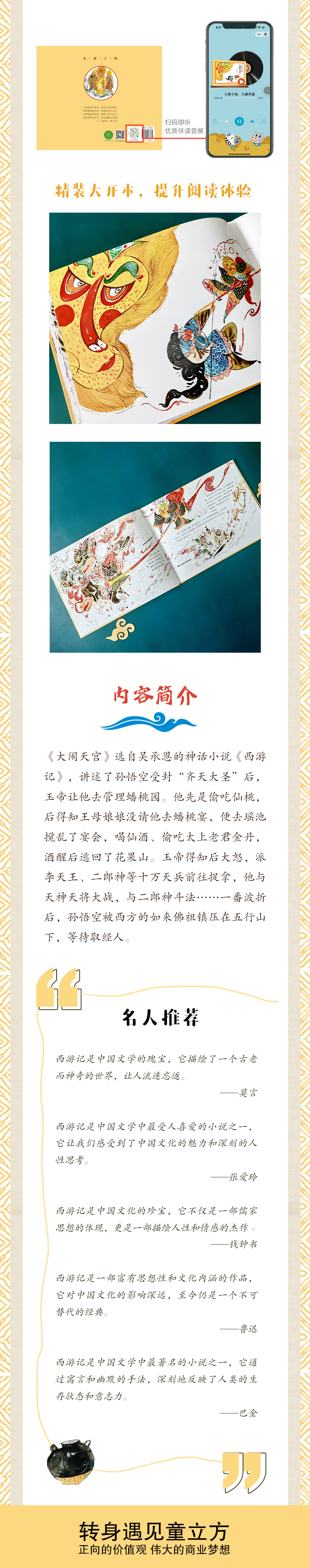 故事主要描写了孙悟空受封“齐天大圣”后,玉帝让他去管理蟠桃园。得知王母没请他去参加蟠桃宴,悟空便去瑶池搅乱了宴会,喝仙酒、偷吃太上老君的金丹,酒醒发现闯了大祸,逃回花果山。玉帝大怒,派李天王、杨戬等十万天兵捉拿……后来被如来压在五行山下。