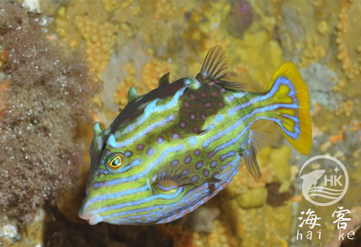 雌雄形态不一样,雄鱼呈现蓝到绿的色彩,而雌鱼呈现褐色及浅灰色纹路。
