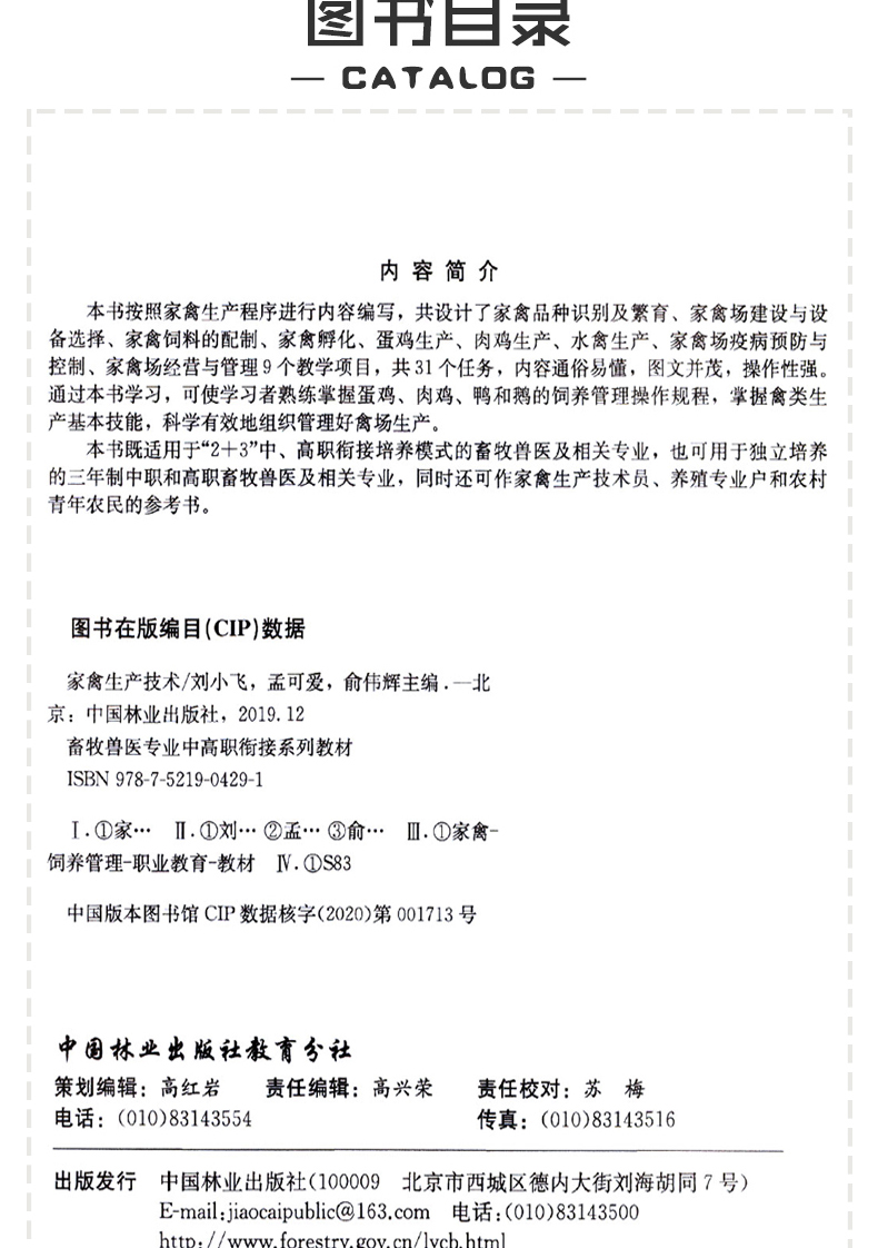 本书按照家禽生产程序进行内容编写,共设计了家禽品种识别及繁育、家禽场建设与设备选择、家禽饲料的配制、家禽孵化、蛋鸡生产、肉鸡生产、水禽生产、家禽场疫病预防与控制、家禽场经营与管理9个教学项目,共31个任务,内容通俗易懂,图文并茂,操作性强。通过本书学习,可使学习者熟练掌握蛋鸡、肉鸡、鸭和鹅的饲养管理操作规程,掌握禽类生产基本技能,科学有效地组织管理好禽场生产。 本书既适用于“2+3”中、高职衔接培养模式的畜牧兽医及相关专业,也可用于独立培养的三年制中职和高职畜牧兽医及相关专业,同时还可作家禽生产技术员、养殖专业户和农村青年农民的参考书。