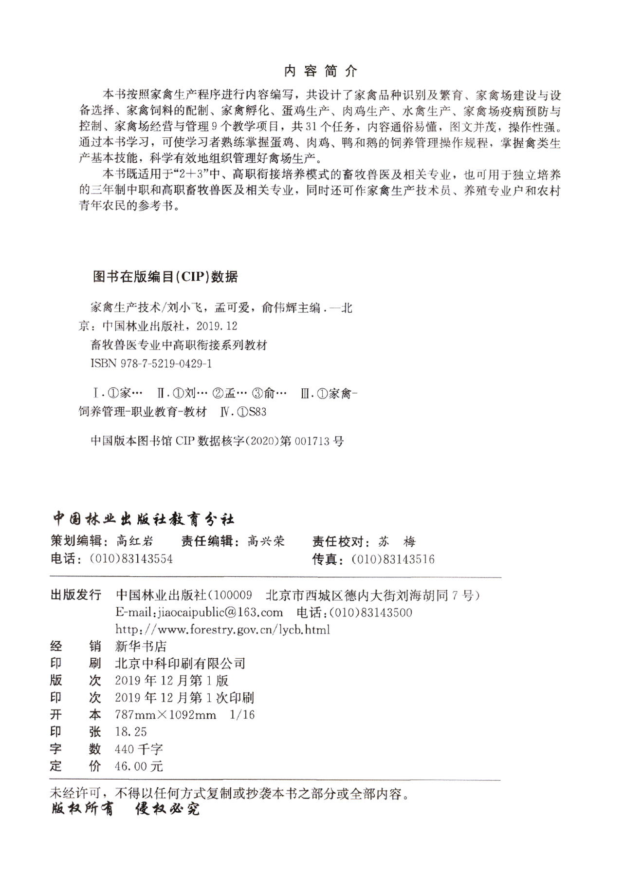 家禽生产技术 刘小飞//孟可爱//俞伟辉 (畜牧兽医专业中高职衔接系列教材) 0429 中国林业出版社