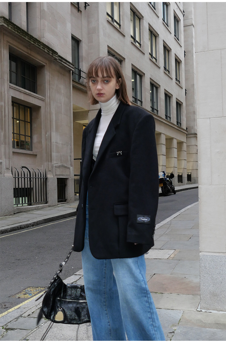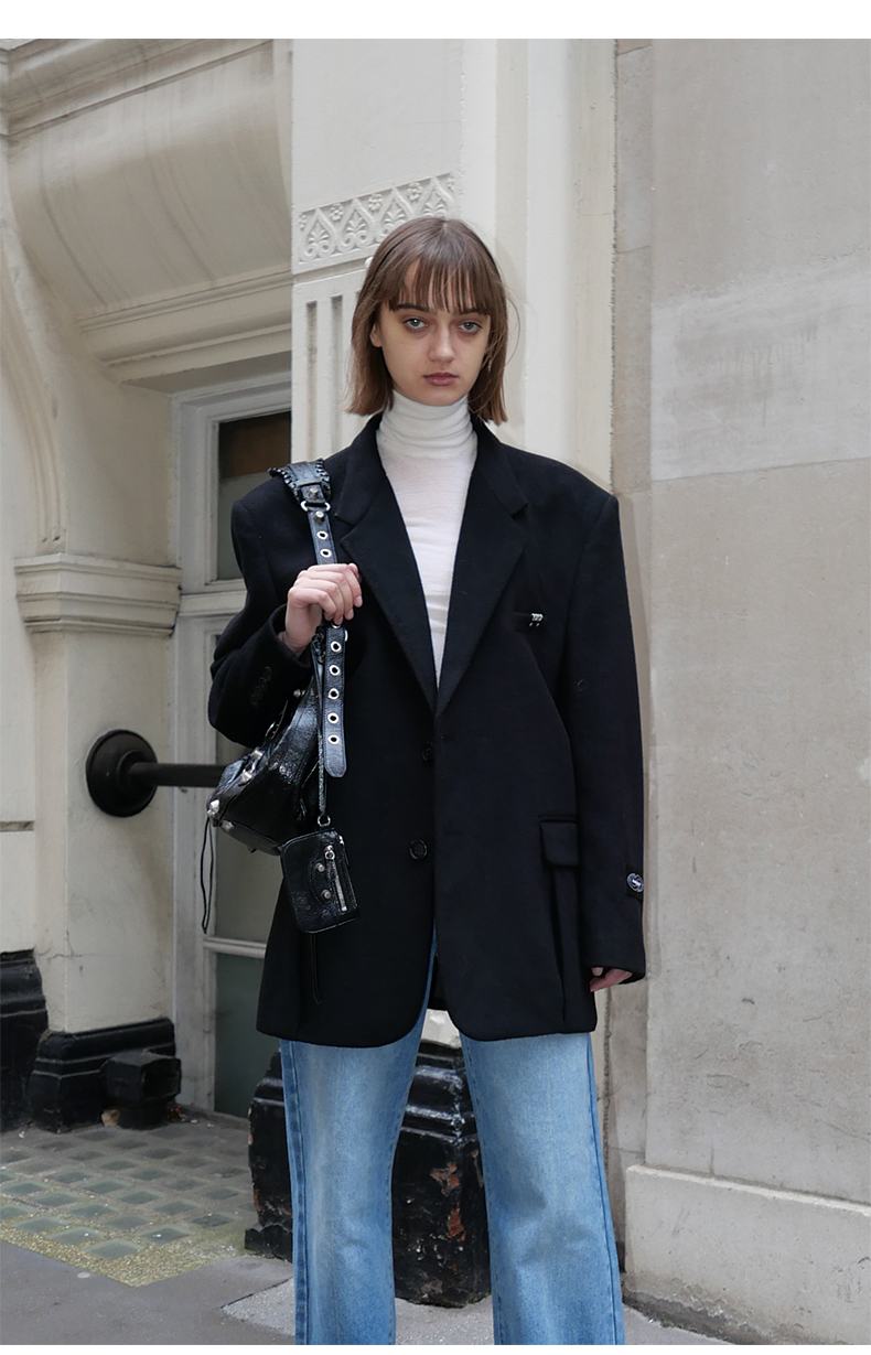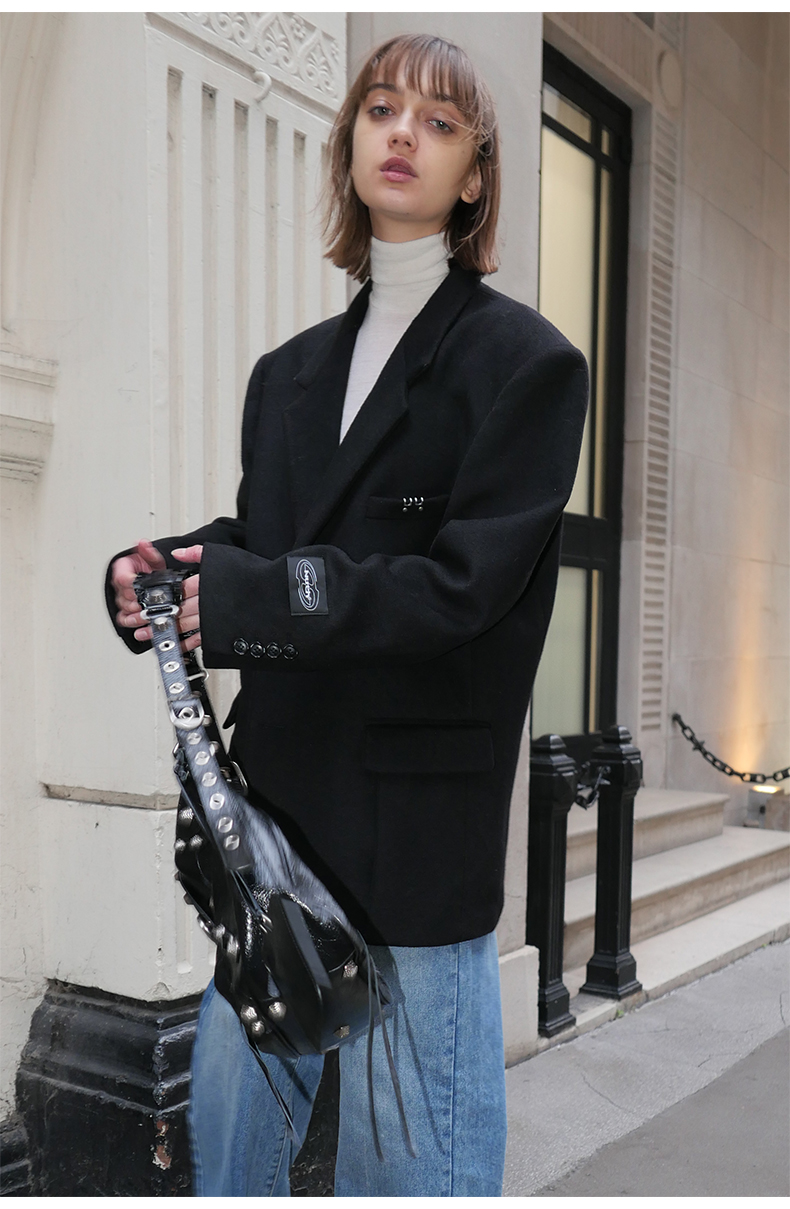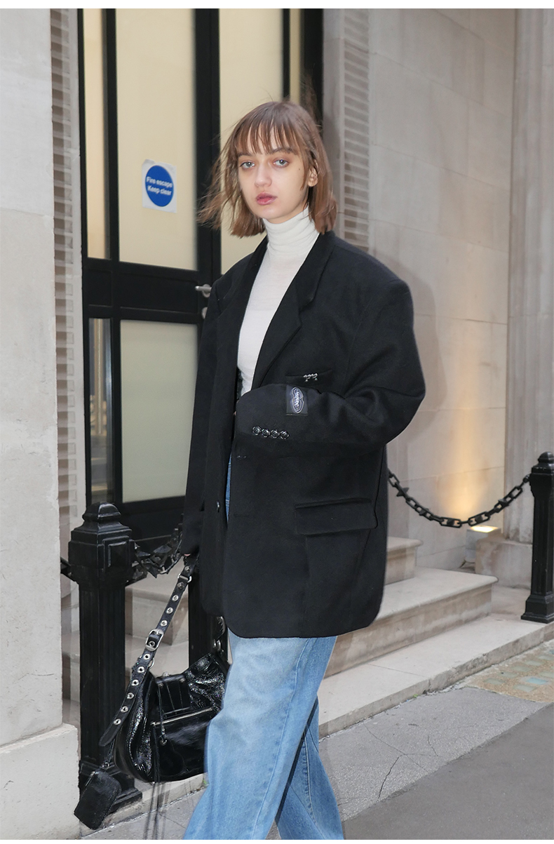 NUTH黑色毛呢西装羊毛呢西服宽松百搭oversize外套