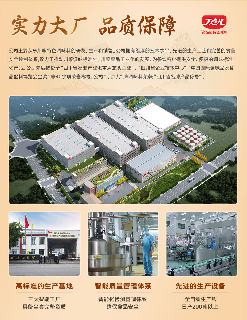 四川丁点儿食品开发股份有限公司,是集川菜调味料研发、生产、销售、服务为一体的现代化企业,专注为餐饮客户提供川菜调味解决方案。公司成立至今,服务了超百万家的餐饮门店以及连锁品牌。
