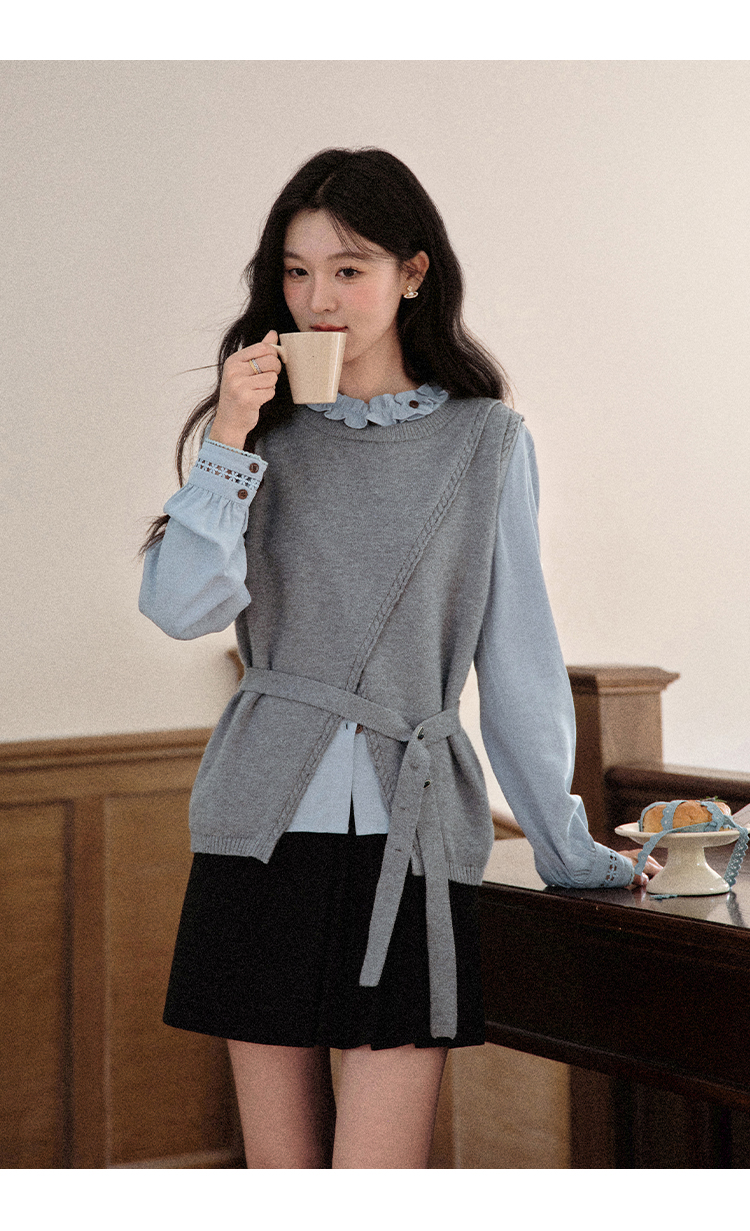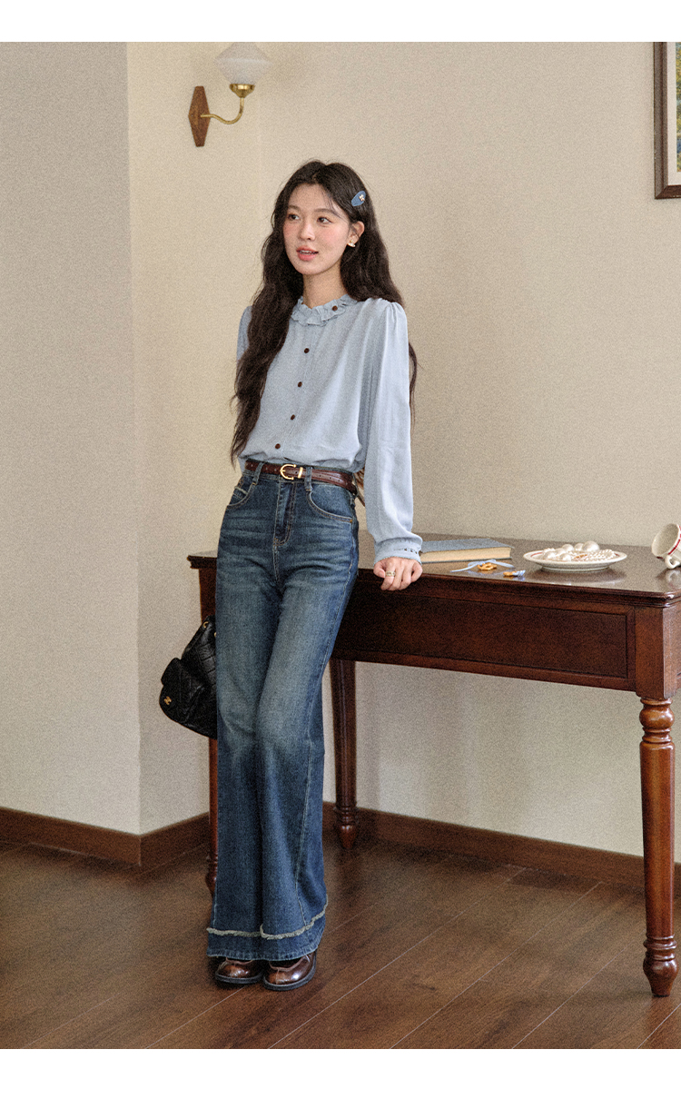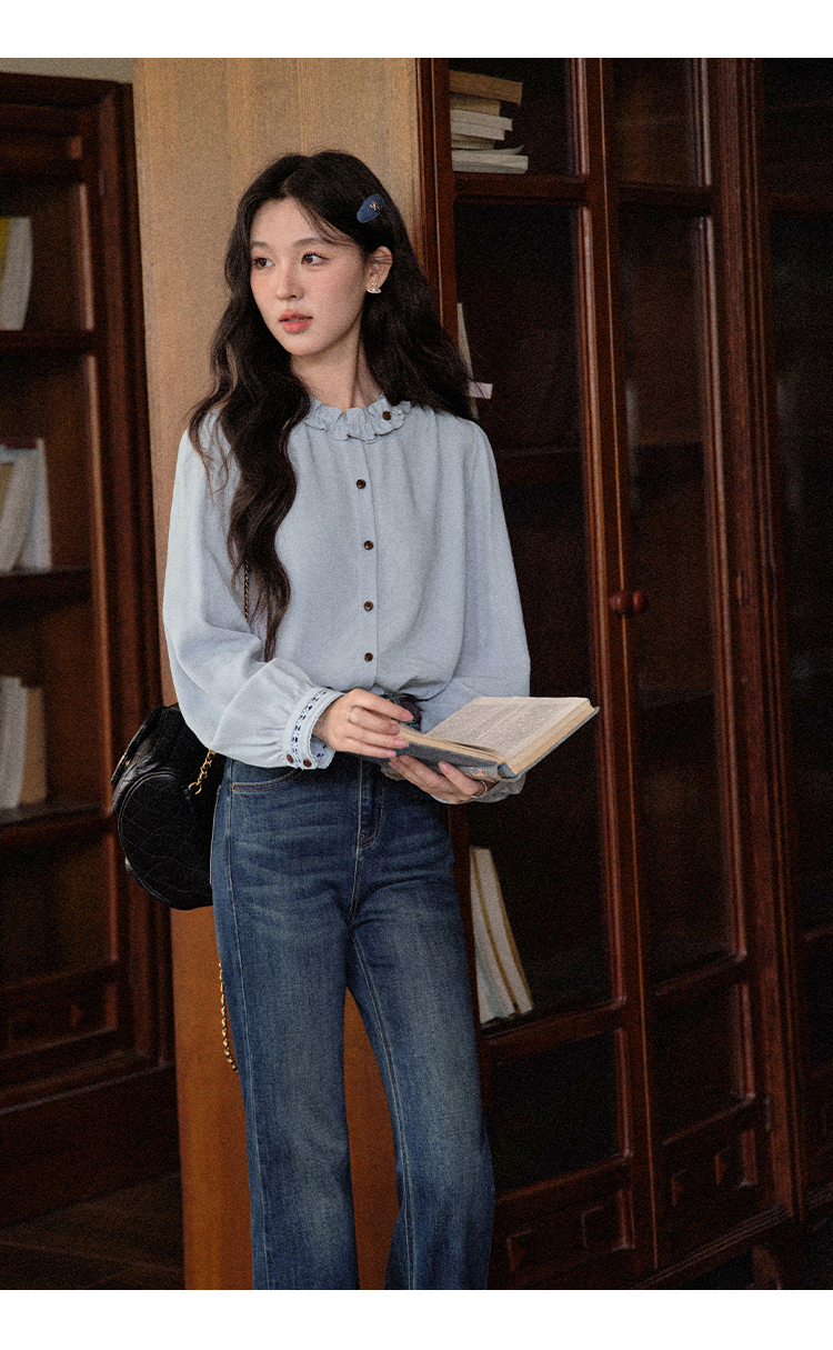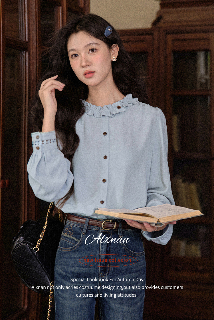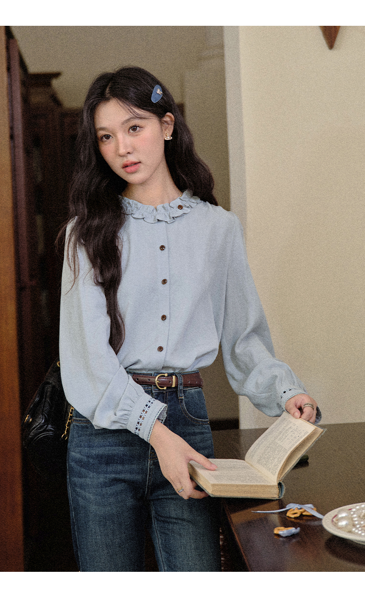 鹿向南「青珀时间海」早秋法式蓝色长袖衬衫新款宽松通勤开衫上衣