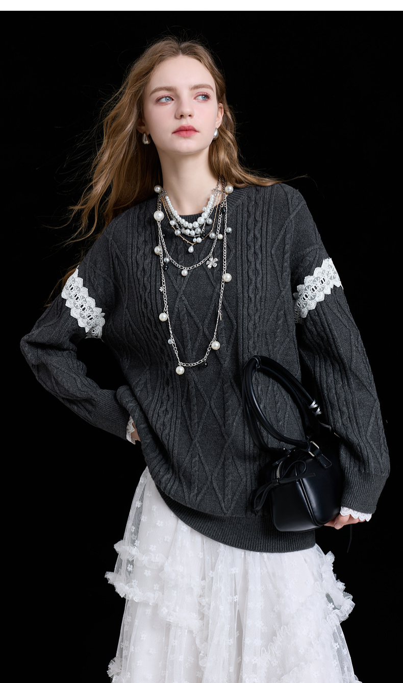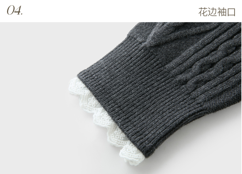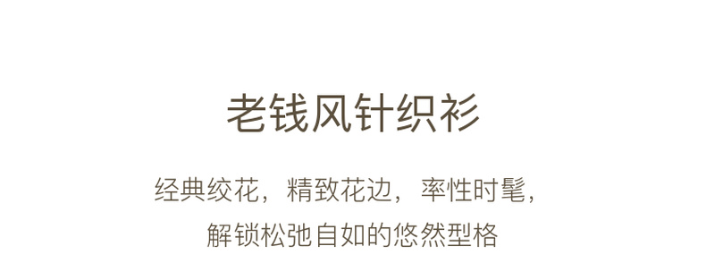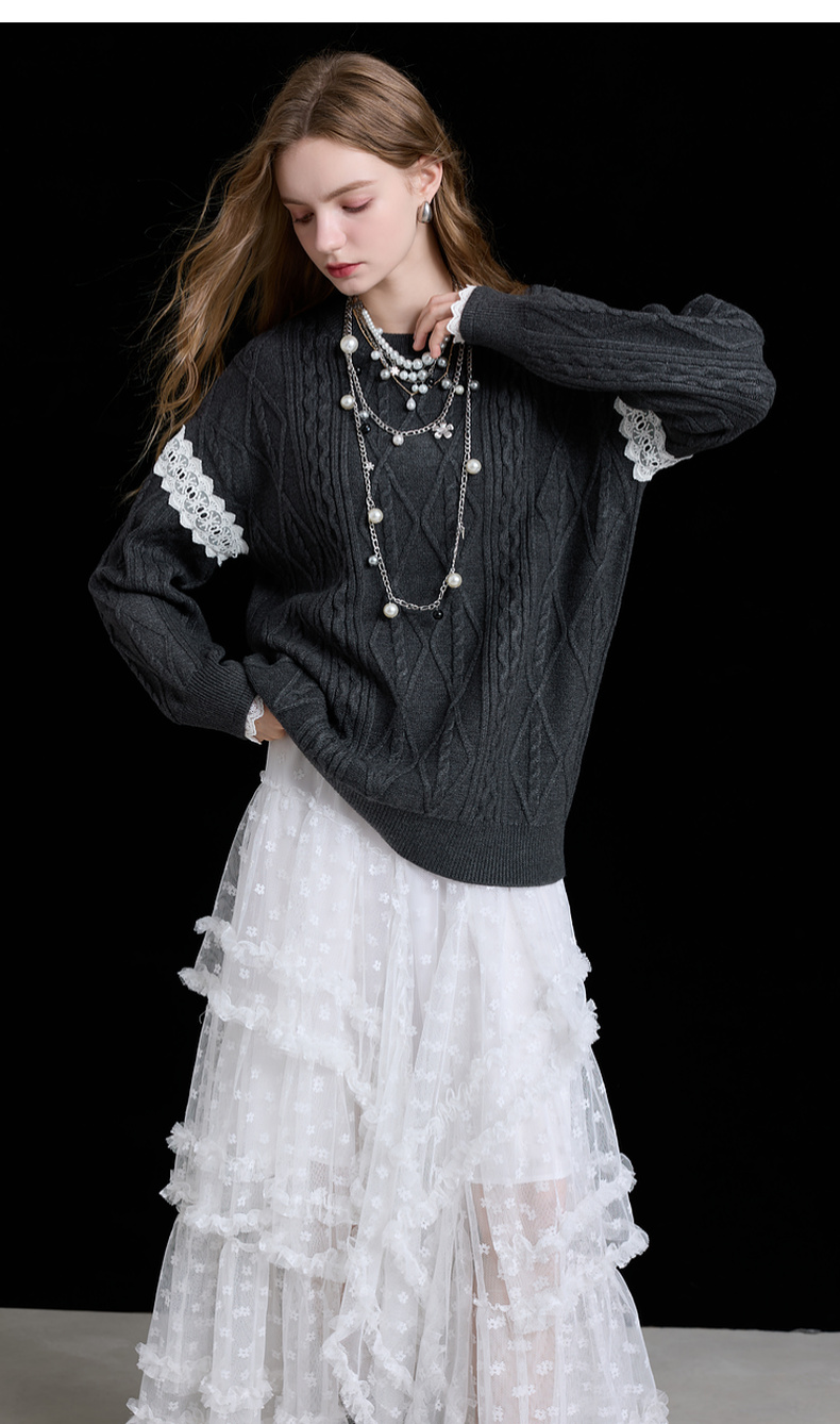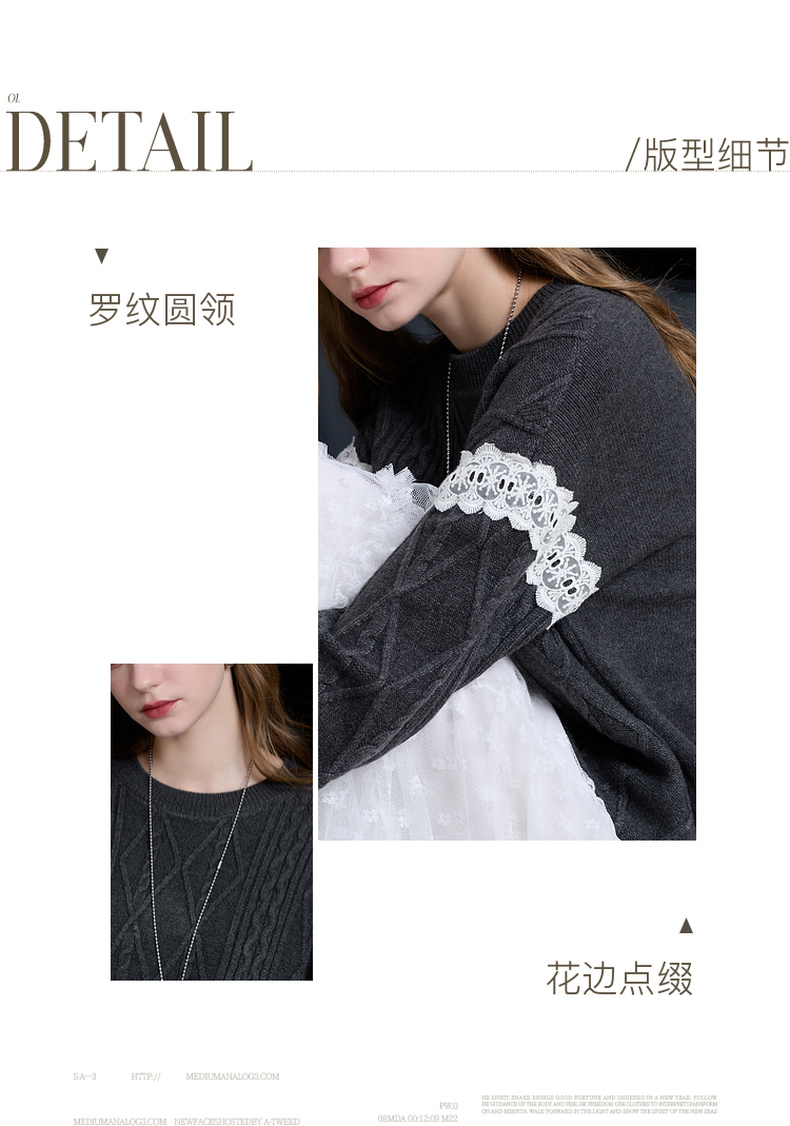 三彩2025冬季新款圆领绞花肌理针织衫长袖花边上衣毛衫宽松简约M