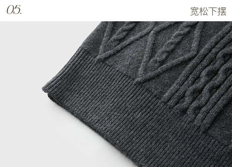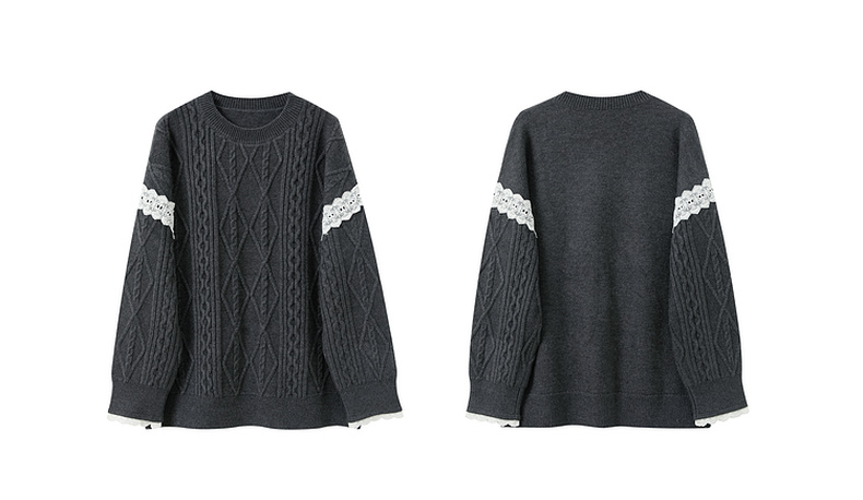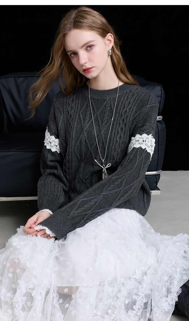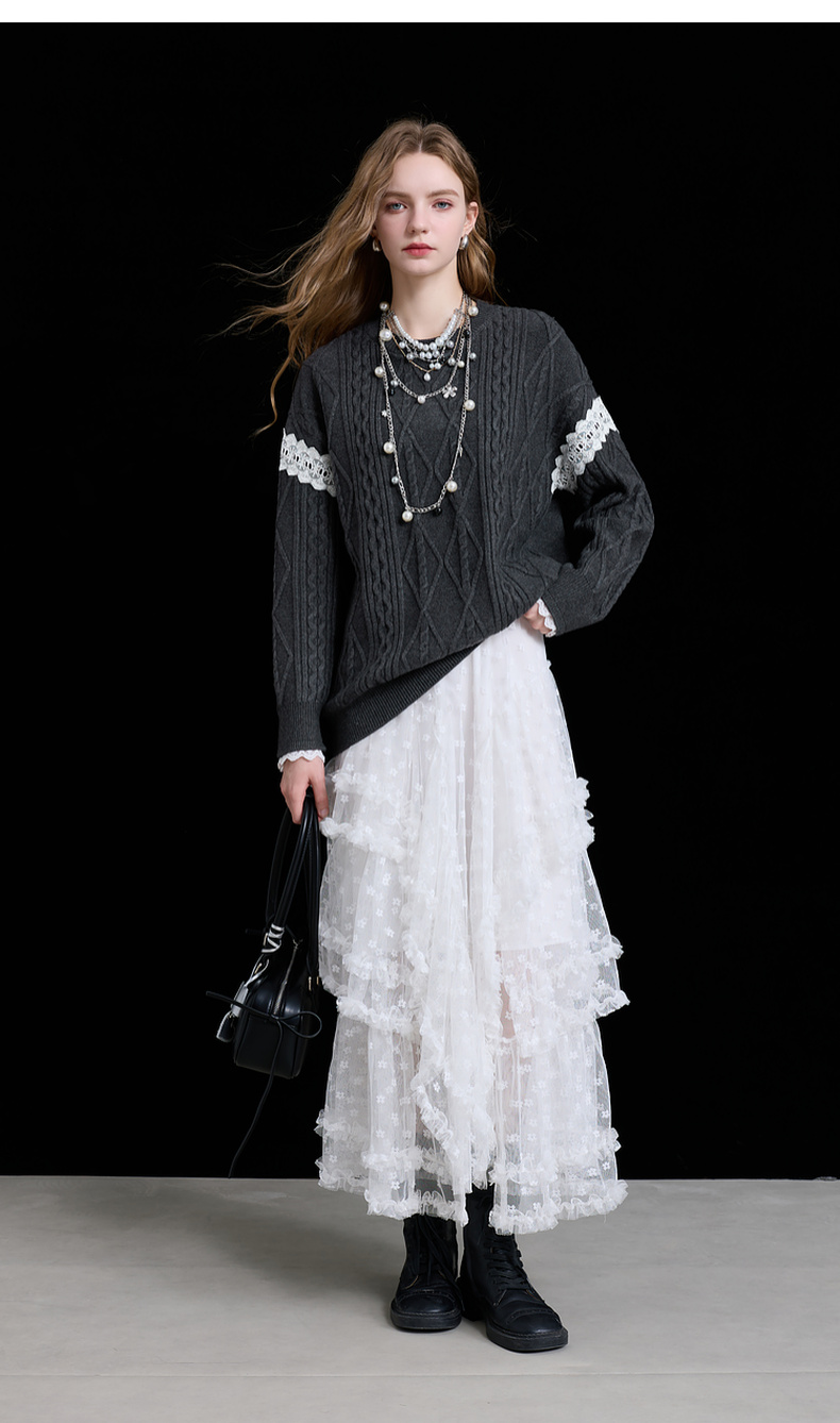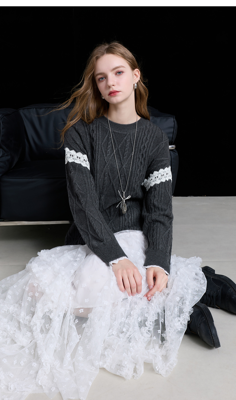 三彩2025冬季新款圆领绞花肌理针织衫长袖花边上衣毛衫宽松简约M