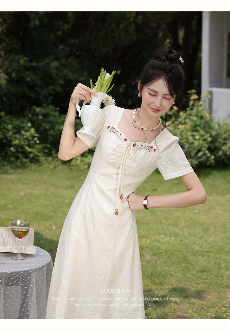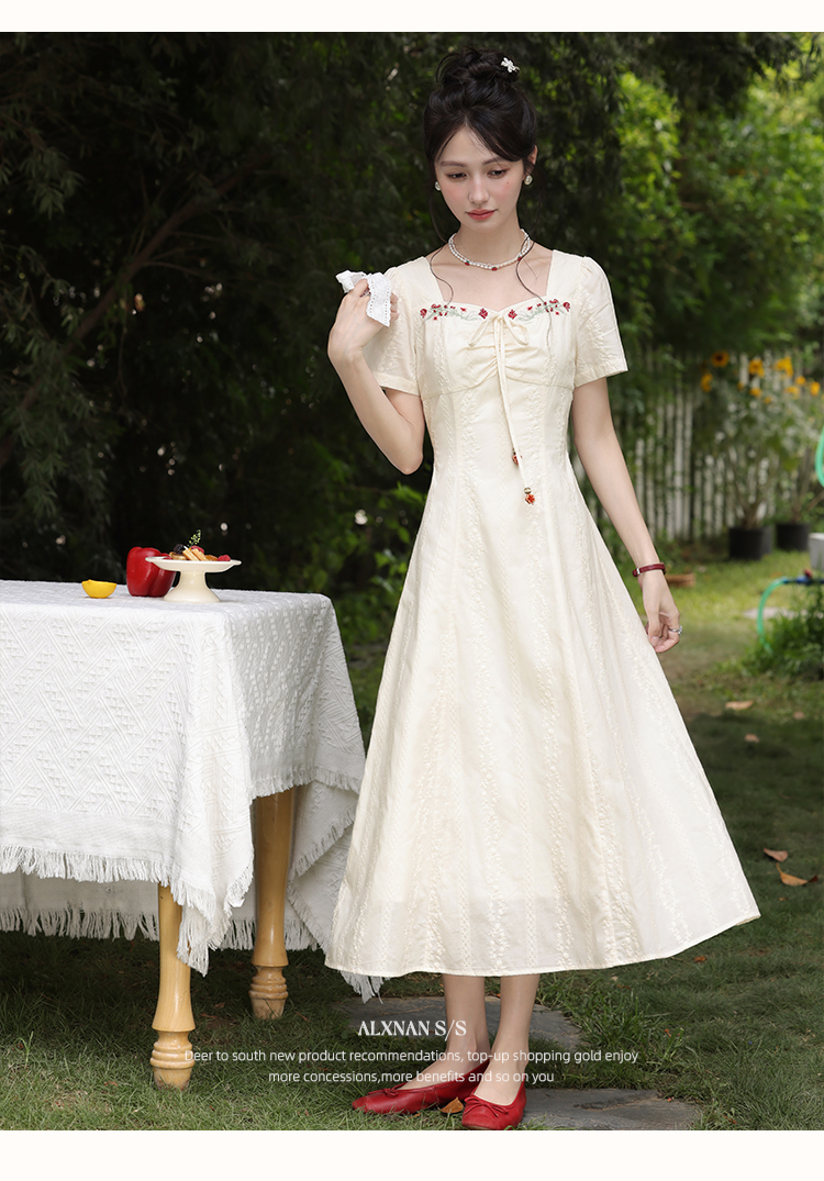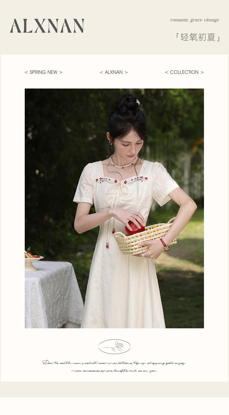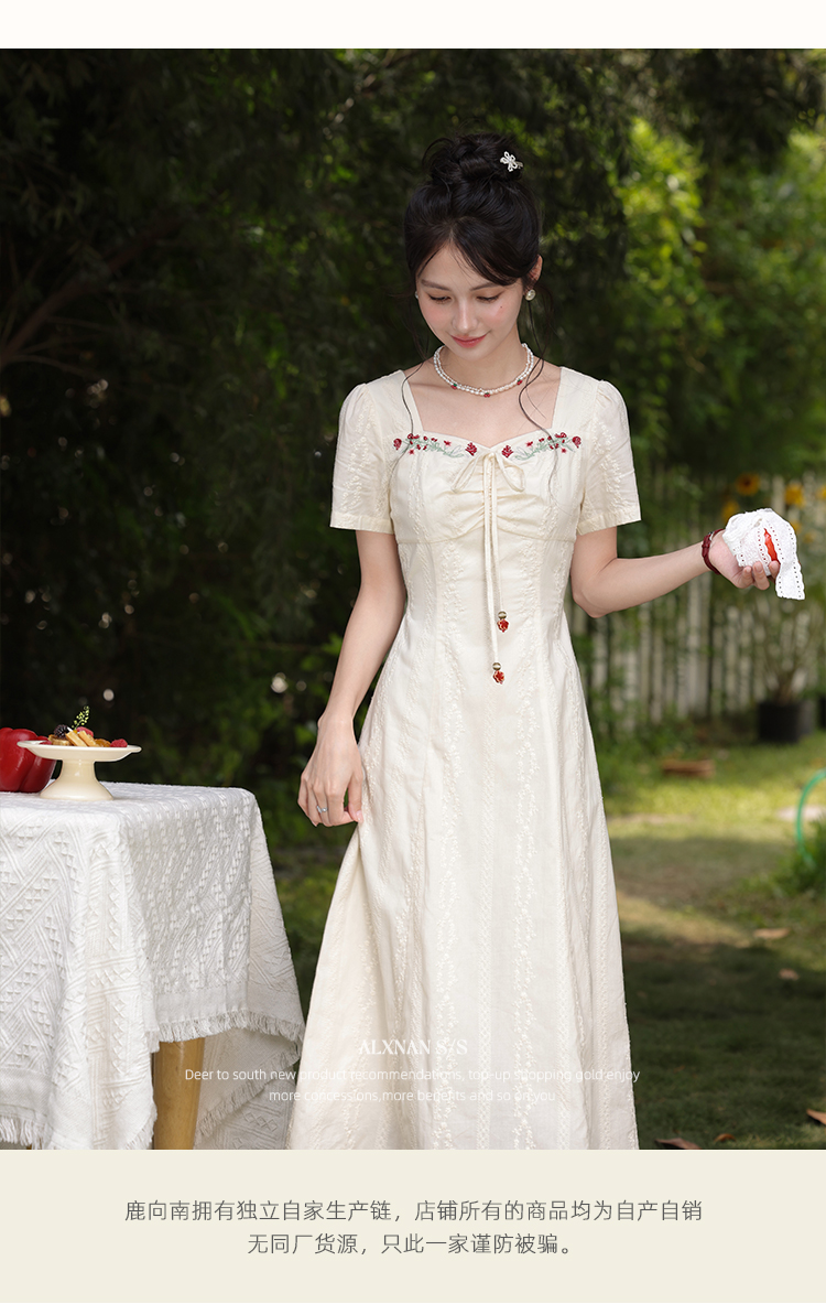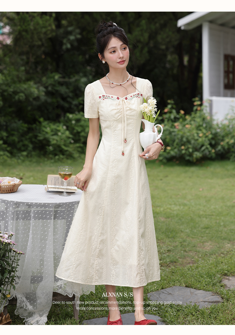 鹿向南「轻氧初夏」气质杏色法式短袖连衣裙女显瘦方领长A字裙夏