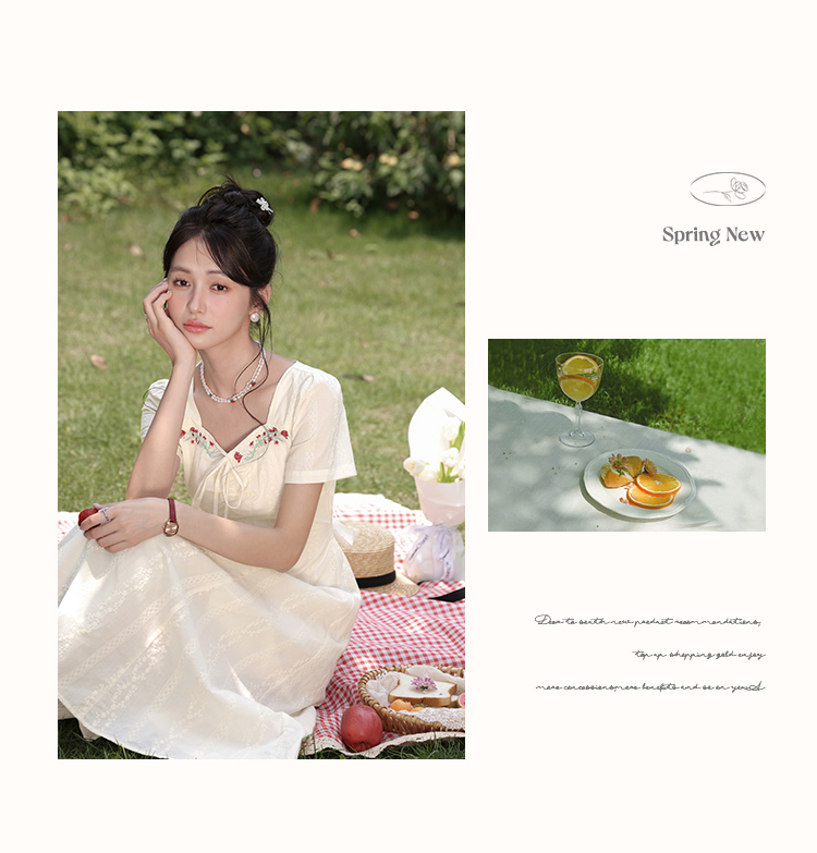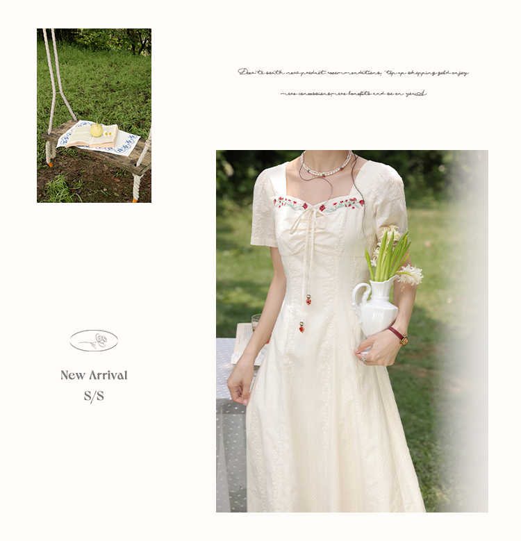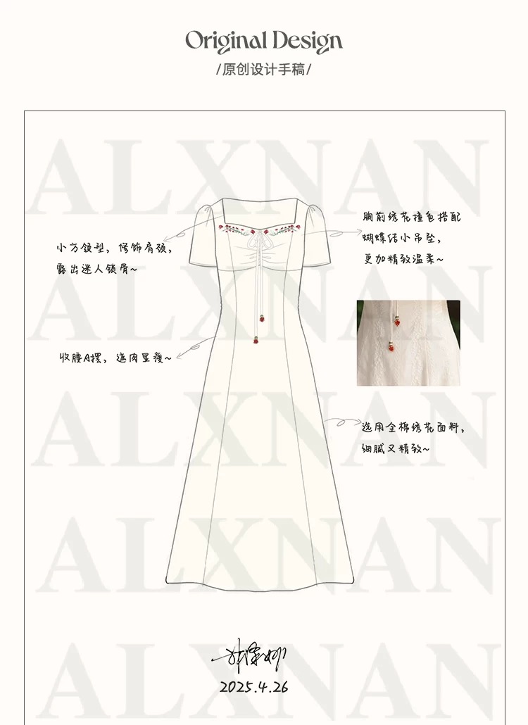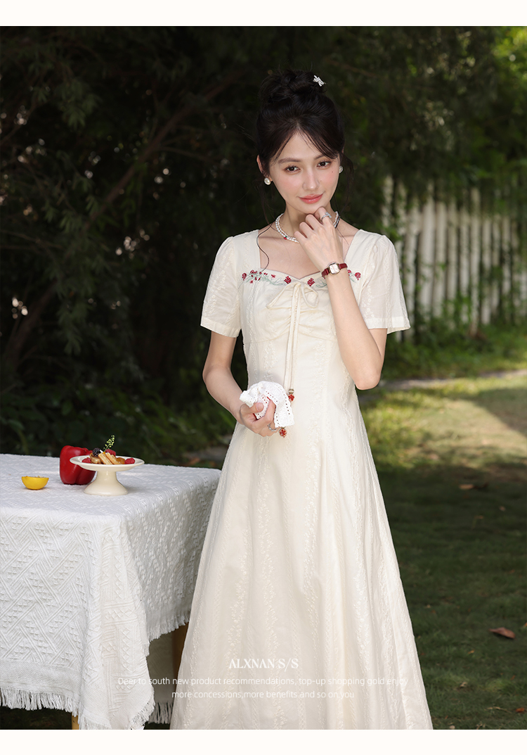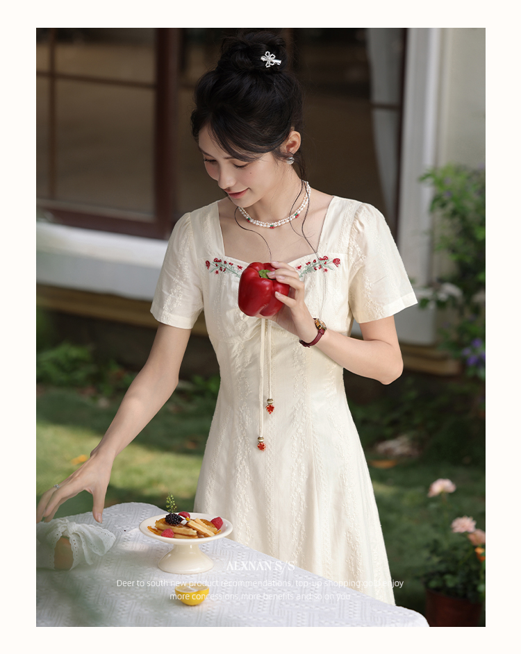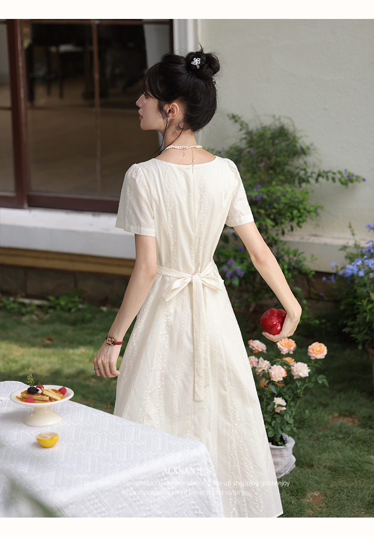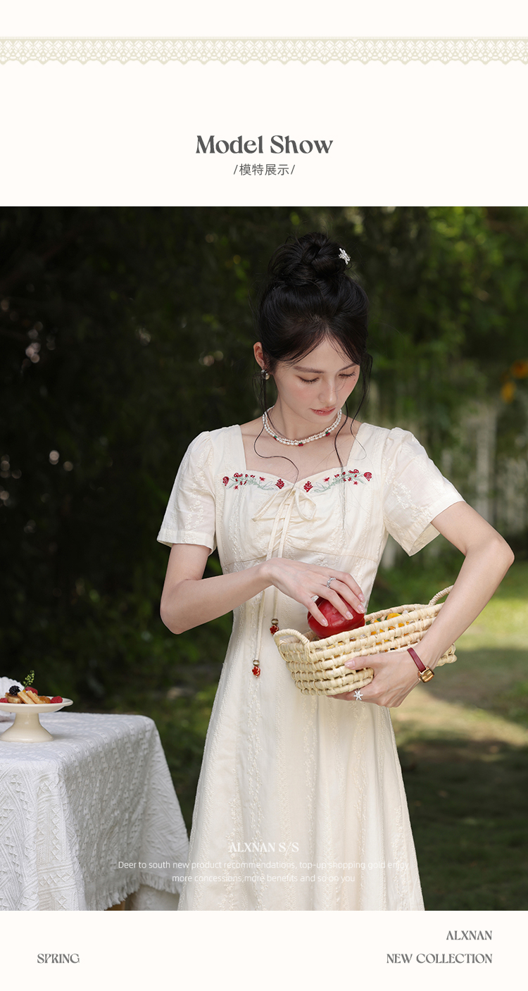 鹿向南「轻氧初夏」气质杏色法式短袖连衣裙女显瘦方领长A字裙夏
