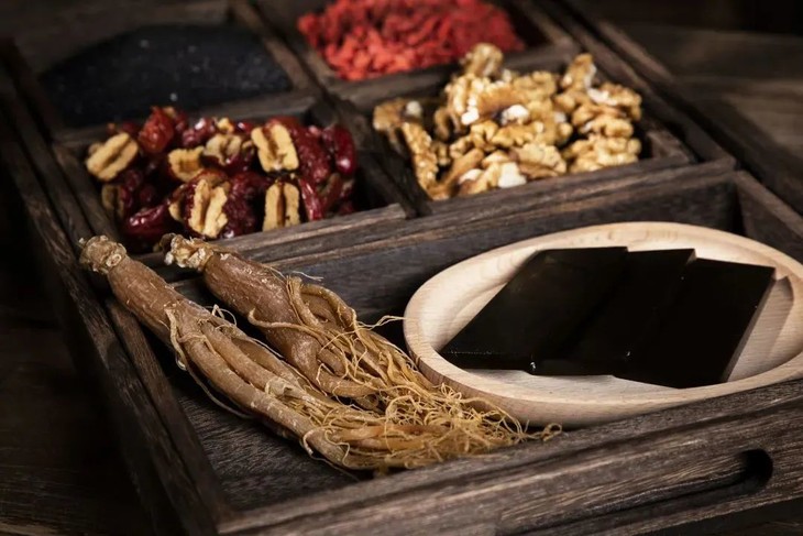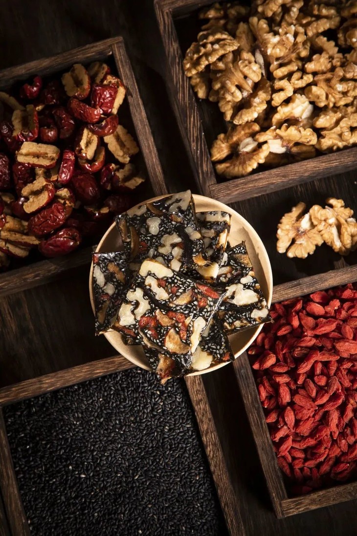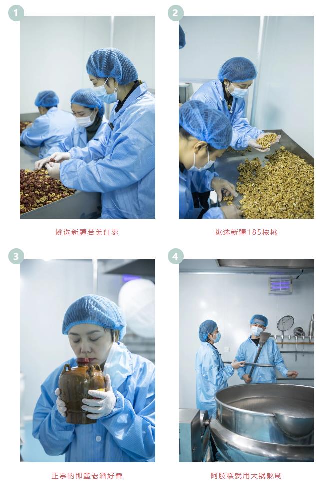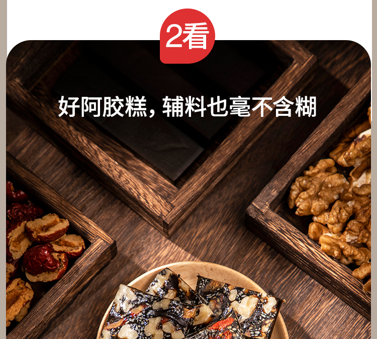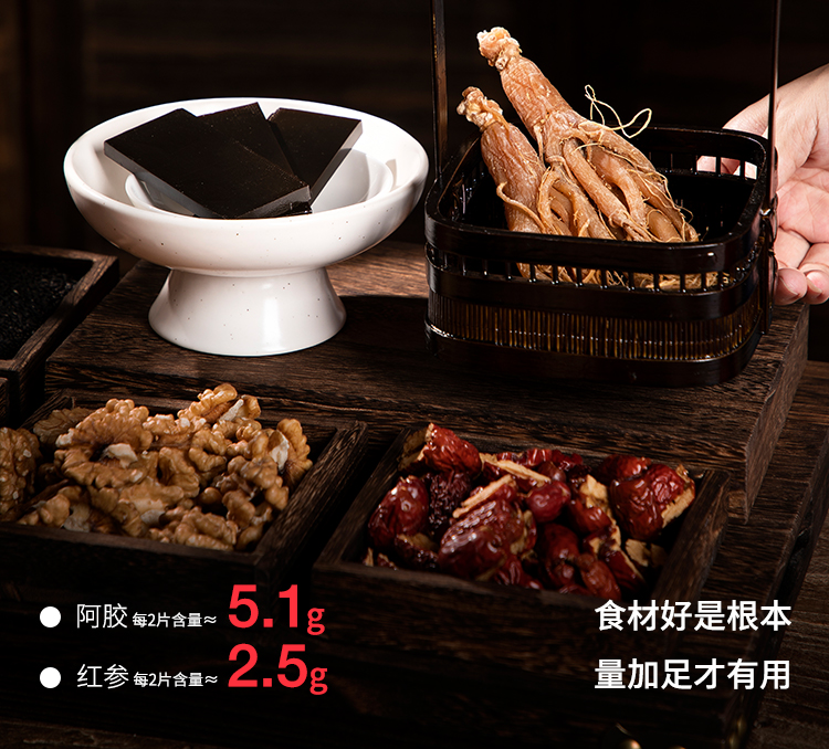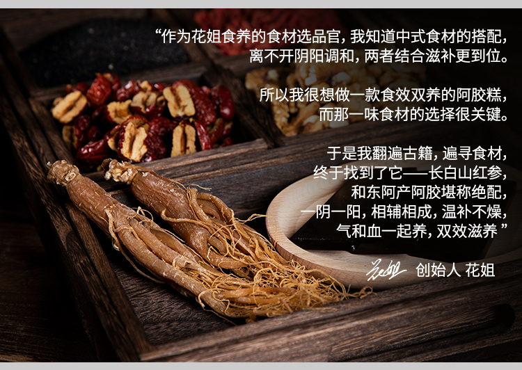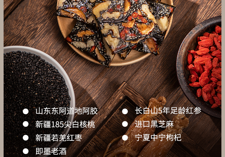 除了阿胶和红参,其他5种食材,花姐都选用道地的好食材,有新疆185尖白核桃、进口黑芝麻、新疆若羌红枣、宁夏中宁枸杞和即墨老酒。