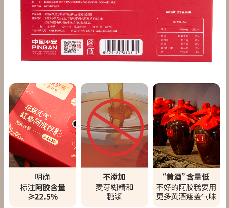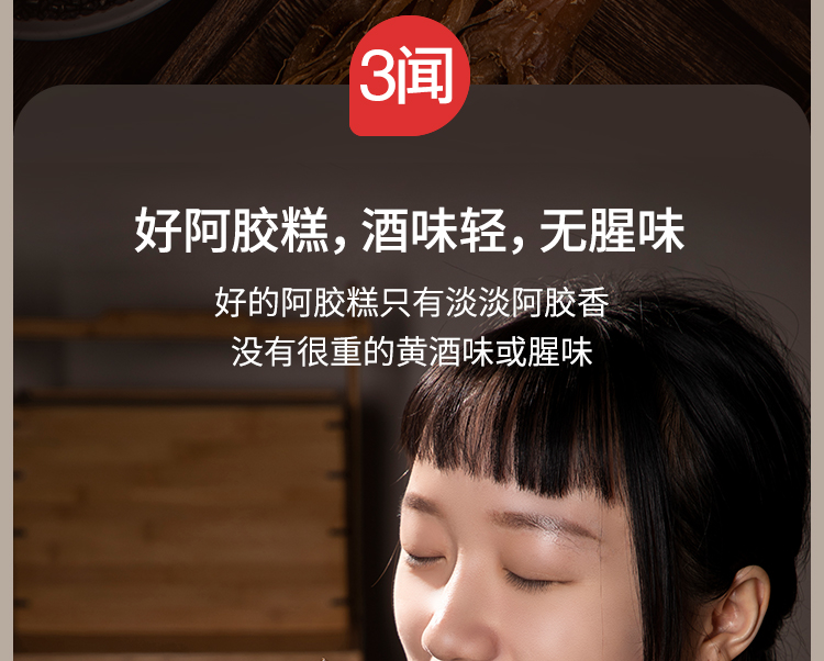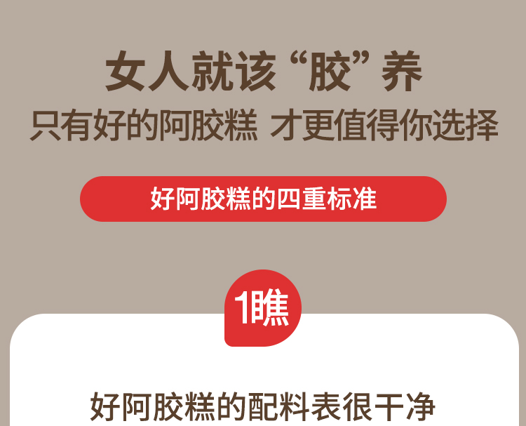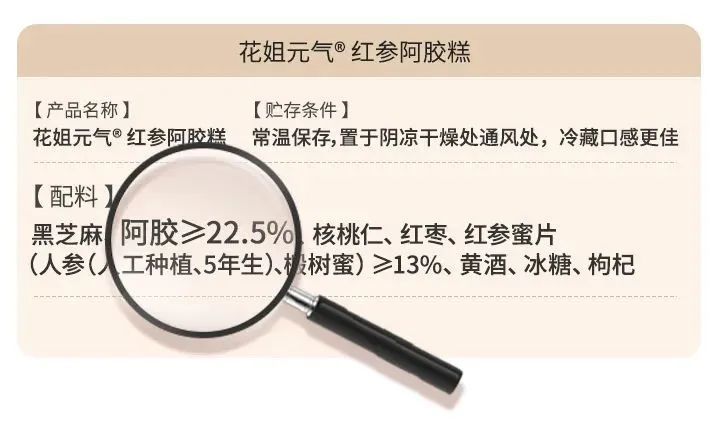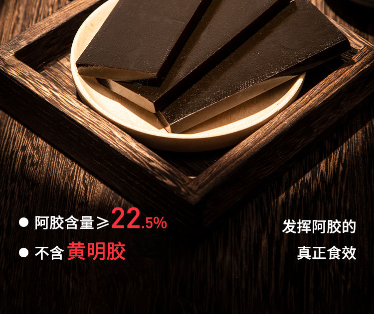 直接标注阿胶含量≥22.5%,不添加麦芽糊精和糖浆,配料表黄酒位置靠后的,好的阿胶糕,只有淡淡阿胶香,没有很重的黄酒味或腥味。