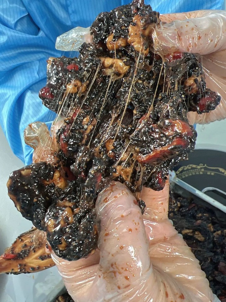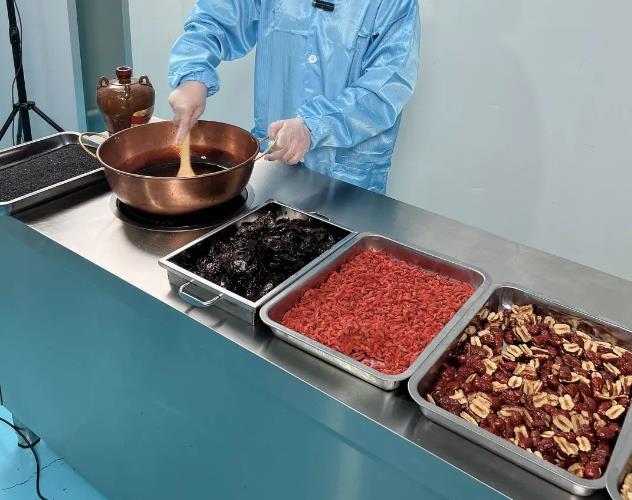 阿胶熬得差不多了,就按顺序加入新疆若羌红枣、长白山5年红参、新疆尖白核桃、宁夏中宁枸杞、进口黑芝麻,不停搅拌。