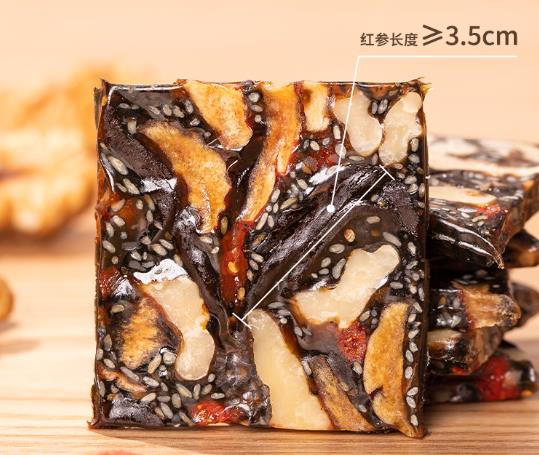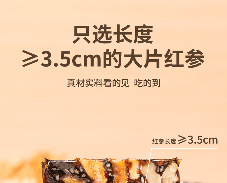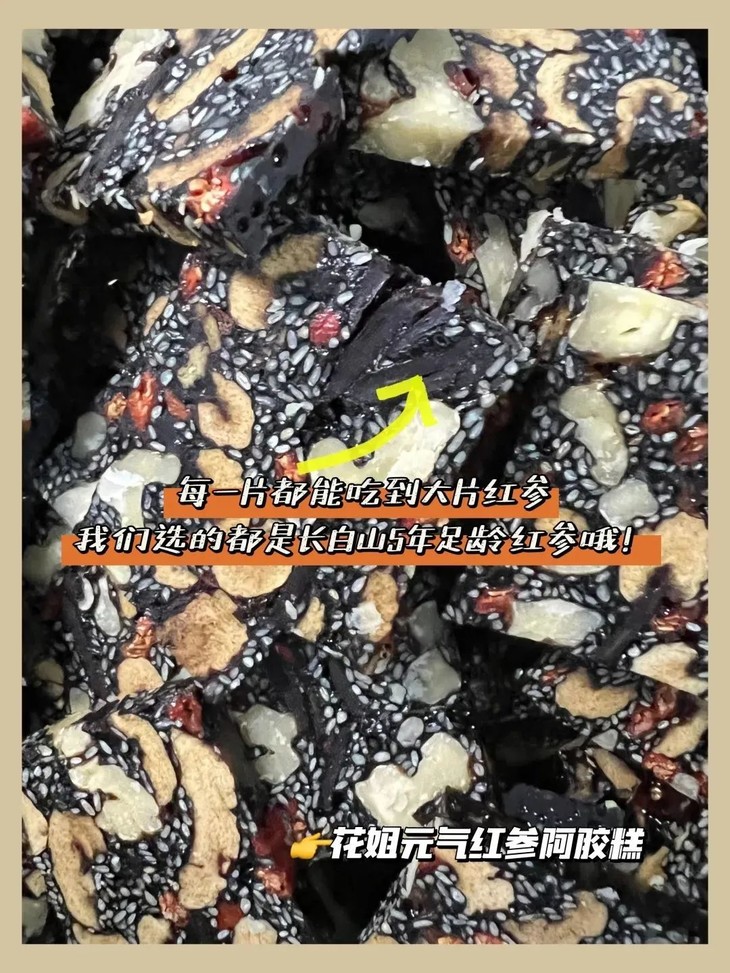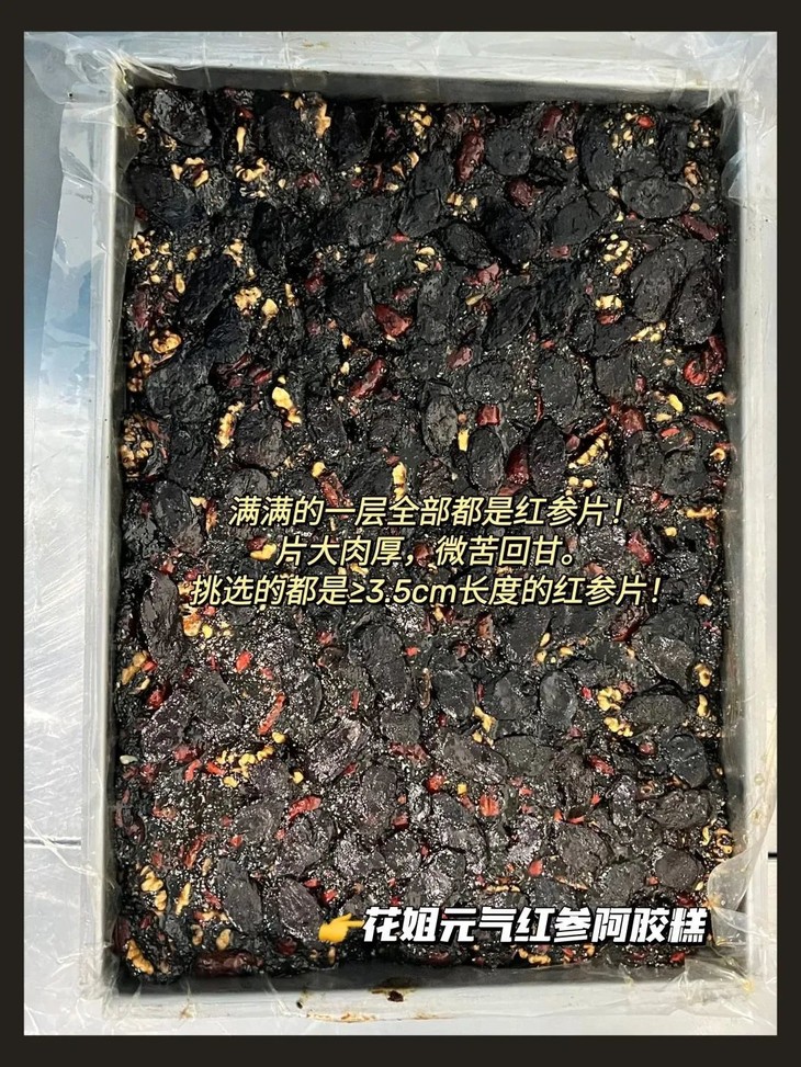 花姐的阿胶糕,只选长度≥3.5cm的红参,确保每一块阿胶糕都能吃到整块的大片红参。