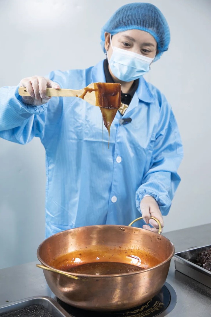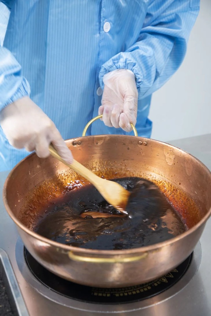 这个过程非常考验耐心和技术,要不断地搅拌30分钟左右,熬到阿胶能挂旗的状态,经验不足的人很容易熬不透或者熬糊锅。