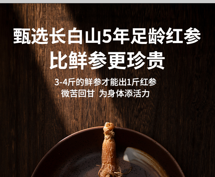 花姐食养选的是长白山足龄红参,5年长成,营养价值高。因为鲜人参里面含水量比较高,而红参是经过古法工艺炮制的,含水量很低。平均3-4斤鲜参才能出1斤红参,非常的珍贵。