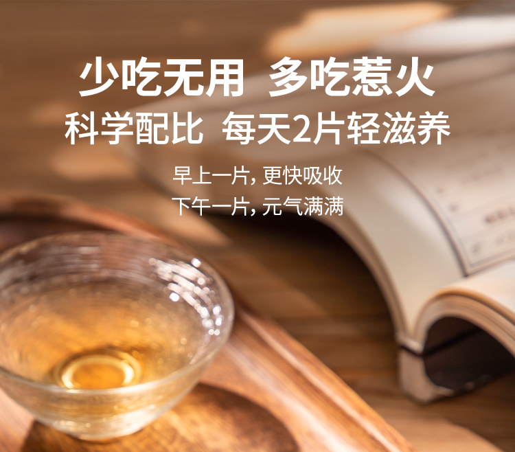 有些姐妹会说,我知道阿胶很好,但是我害怕吃了上火。我们早就帮你你想到了,科学配比阿胶和红参的量,每天2片轻滋养刚刚好。