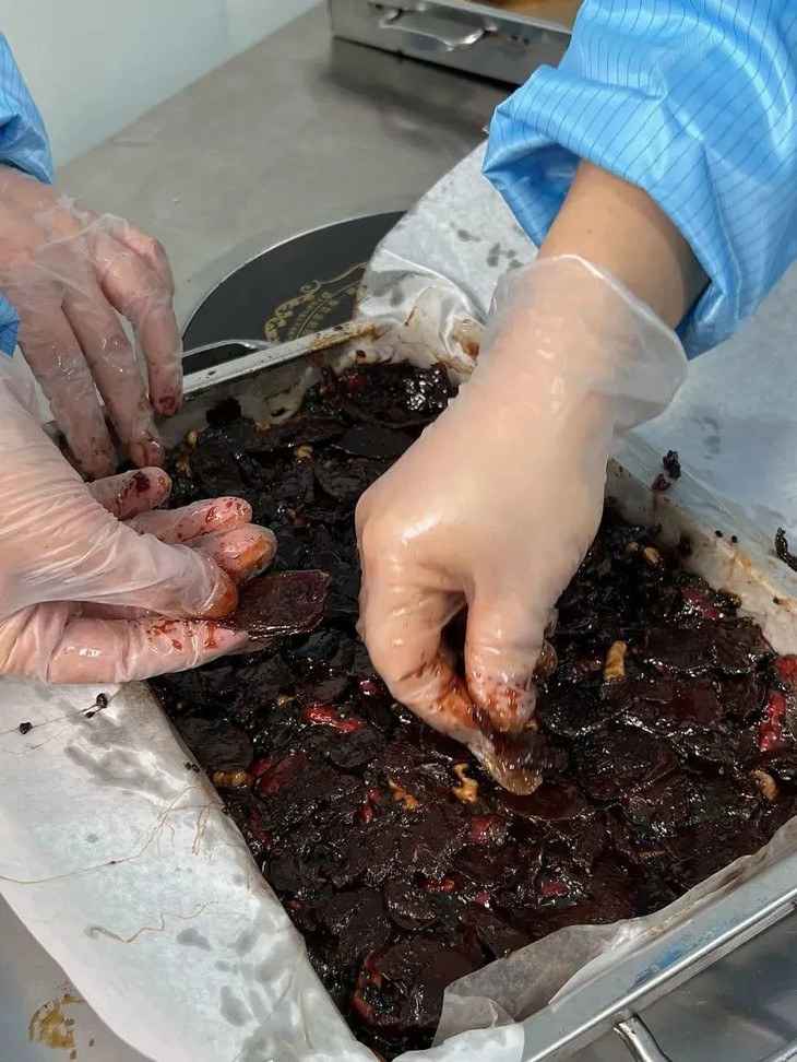 接着就是把搅拌好的原料放入模具中,我们还会人工铺上满满一层红参,这样才能确保花粉们每一口都能吃到整块的大片红参(我们只选长度≥3.5cm的大片红参),最后再用工具压实。