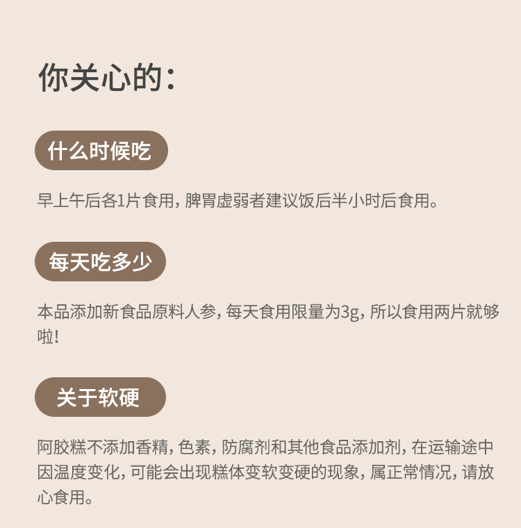 早上空腹吃吸收好,下午吃补充能量,1天2片保证阿胶的量但又不会上火。独立小袋真空包装,方便携带也不会吸潮。