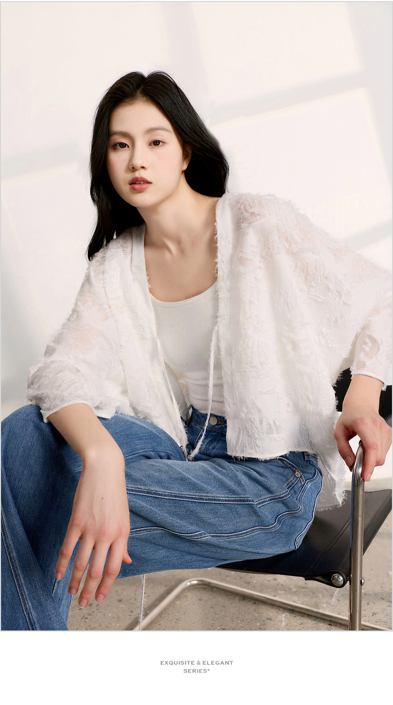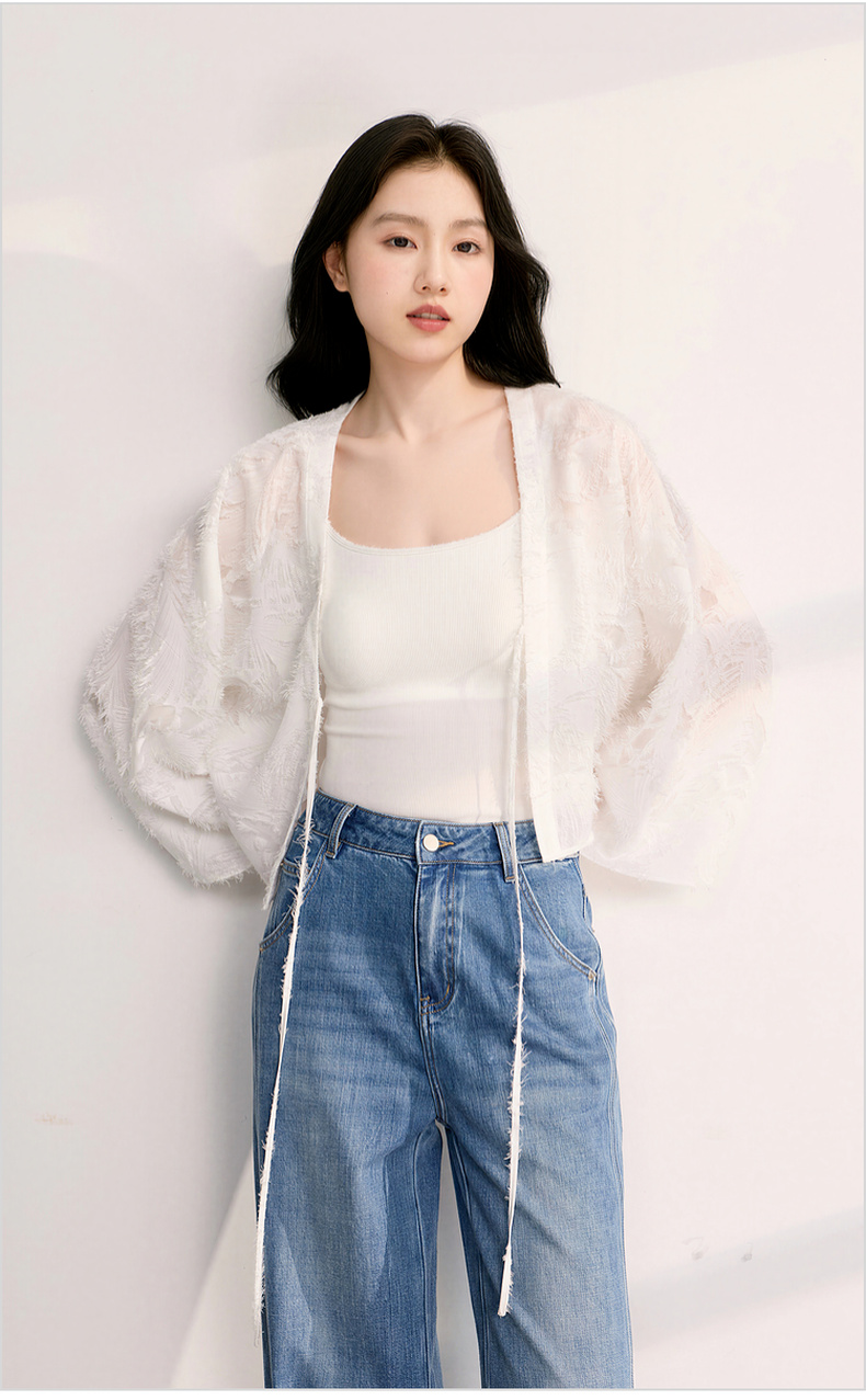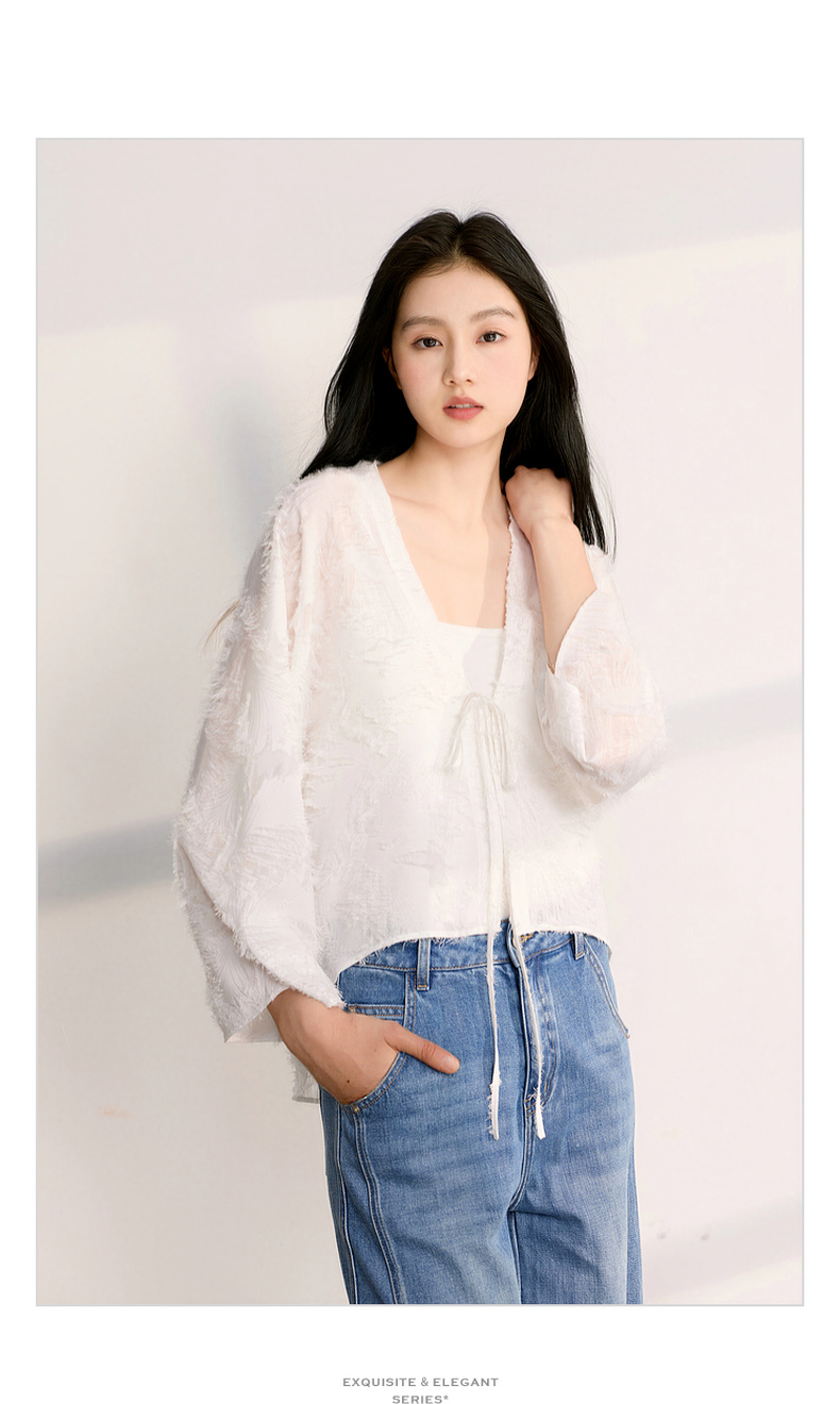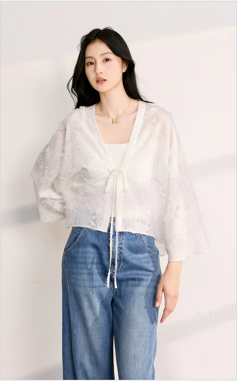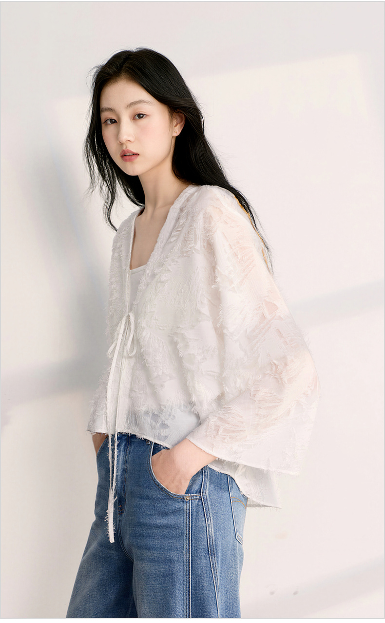 三彩2026新款法式羽毛肌理披肩外搭米白柔美系绳短款仙气氛围约会