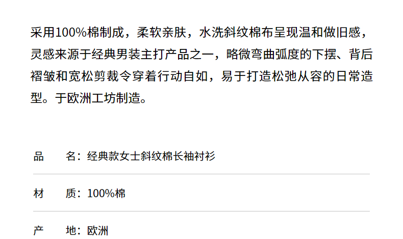 SUNSPEL女士经典款棉斜纹布长袖衬衫