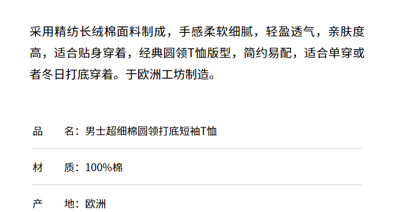 SUNSPEL男士经典款精纺长绒棉圆领经典T恤春夏舒适透气
